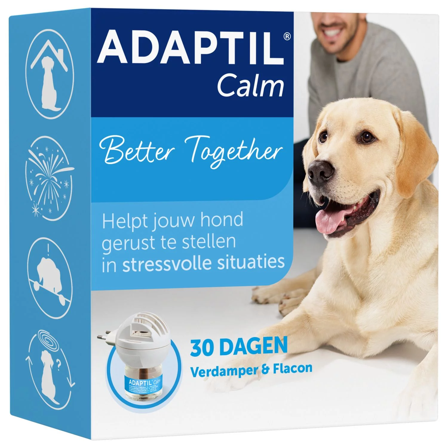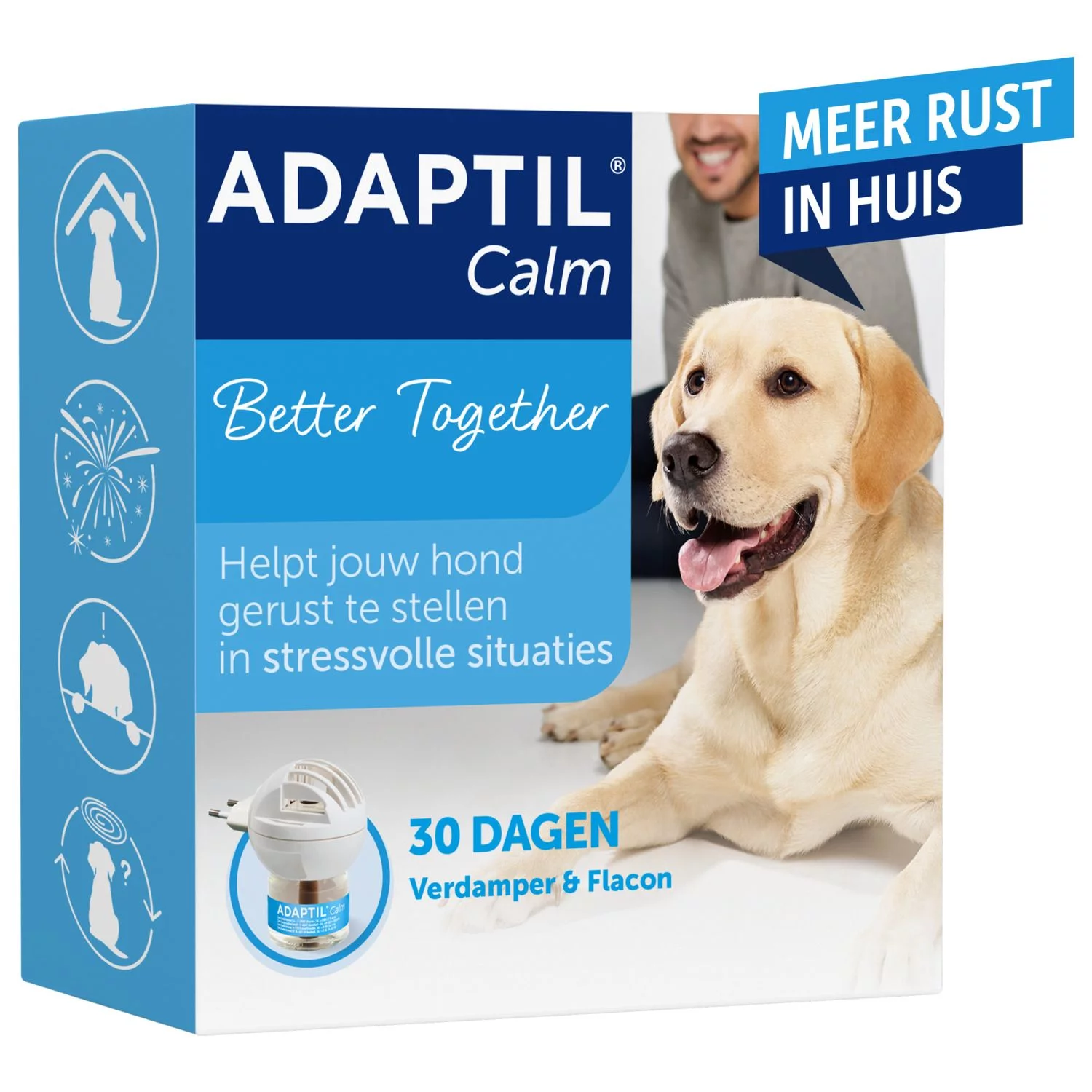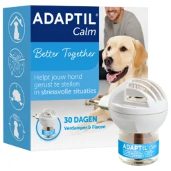 Adaptil is een natuurlijke en praktische oplosssing tegen angst of stress bij honden. Denk aan moeilijke situaties als vuurwerk en alleen thuis blijven. Of aanpassen aan een nieuwe omgeving: adoptie, puppycursus, verhuizing, etc.De Adaptil elektrische verdamper wordt in het stopcontact in de ruimte geplaatst waar de hond het meest verblijft. Eén flacon is voldoende voor een 30 dagen durende behandeling van zo’n 50-70 m2. Adaptil is opmerkelijk effectief. Volgens de fabrikant stopt 72-85% van de honden na 1 maand met blaffen en vernielen wanneer ze alleen worden gelaten. De positieve effecten zijn al snel zichtbaar, meestal in de eerste week van de behandeling. Voor het beste resultaat wordt aanbevolen de Adaptil -verdamper minstens 2 maanden te gebruiken, tezamen met gehoorzaamheidstraining.