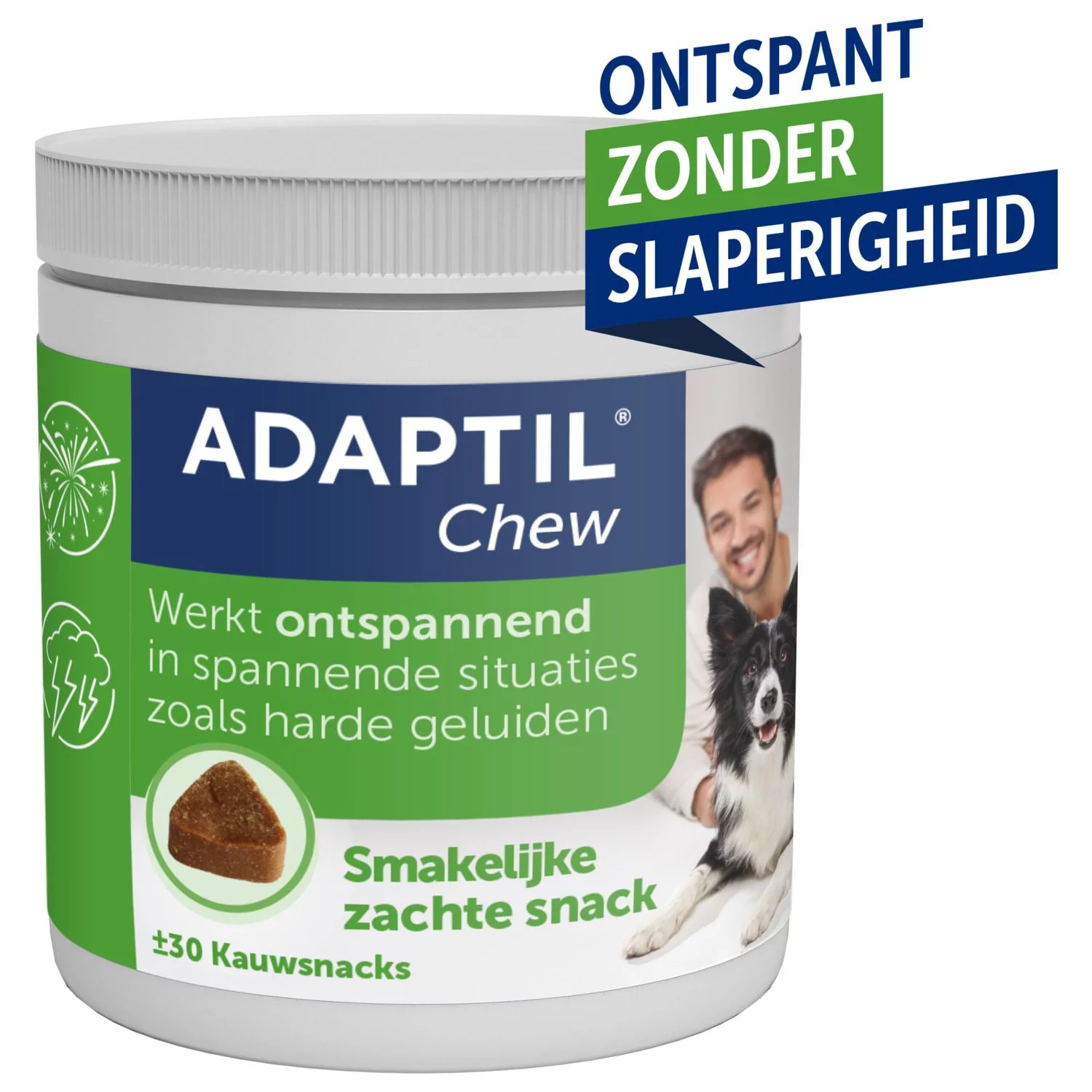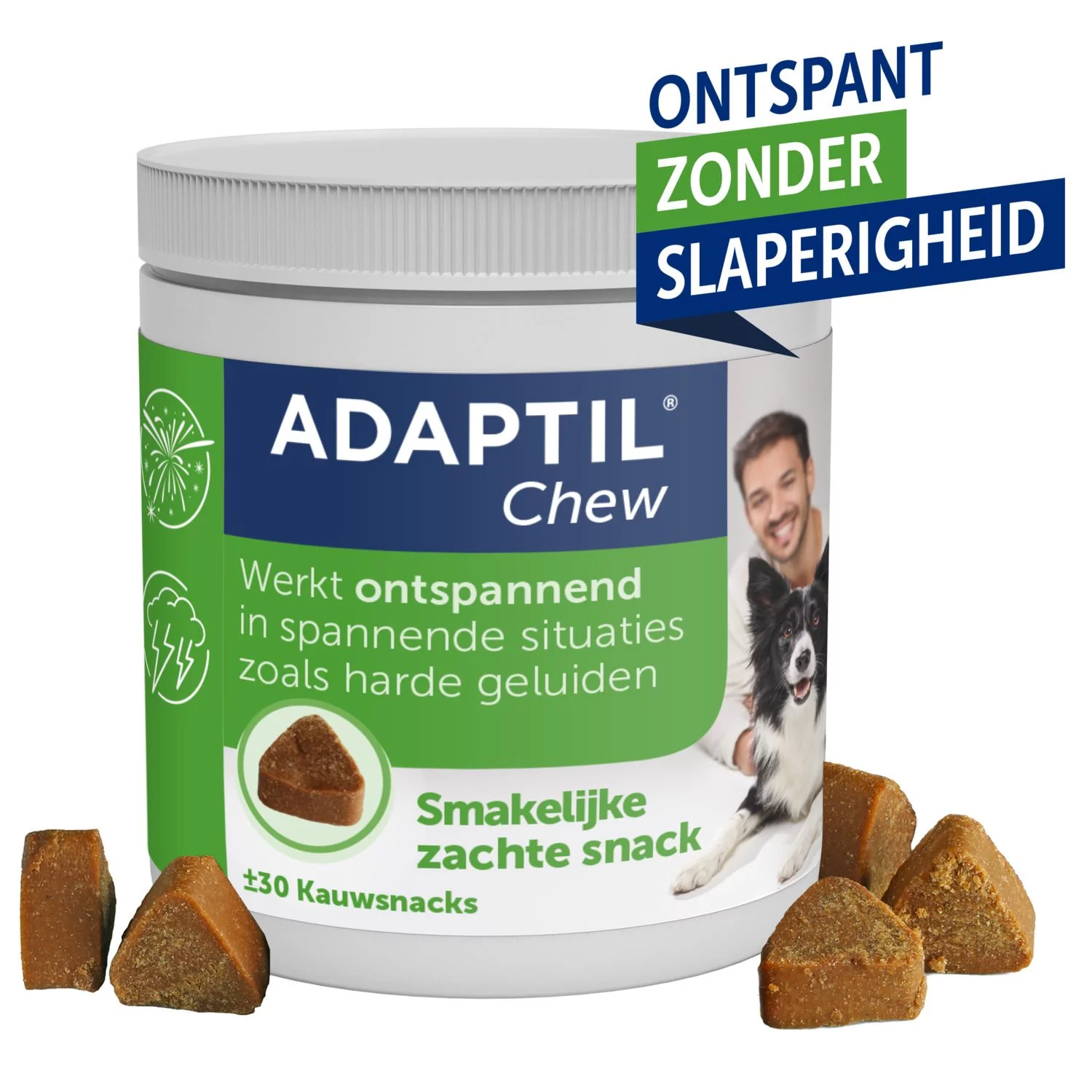 •ADAPTIL Chew werkt ontspannend voor honden in stressvolle situaties •ADAPTIL Chew om honden snel te helpen relaxen in stress situaties (harde geluiden: vuurwerk, onweer, visite, transport, bezoek aan de dierenarts, trimsalon, hondenshows, etc.) •Verbeterde formule met natuurlijke ingrediënten •Ontspannen honden zonder hen slaperig te maken •Veilig en werkt niet verslavend •11 kcal per kauwsnack