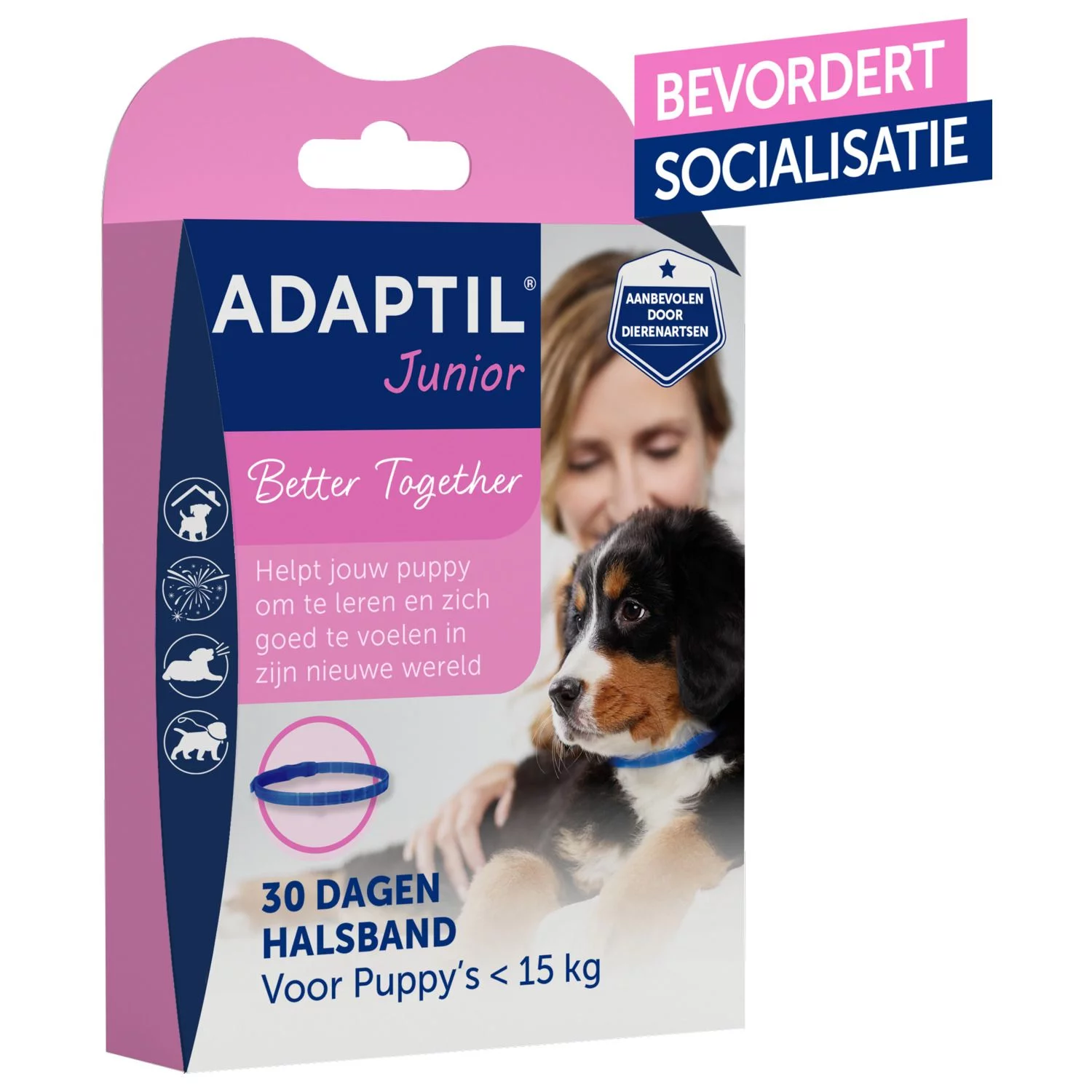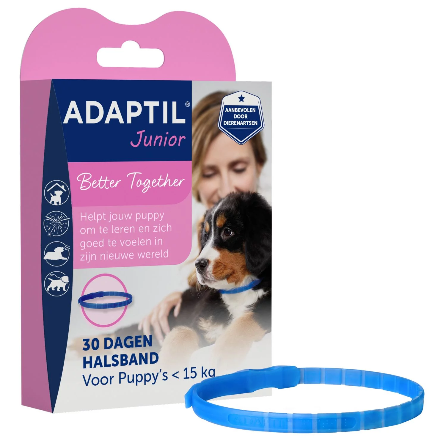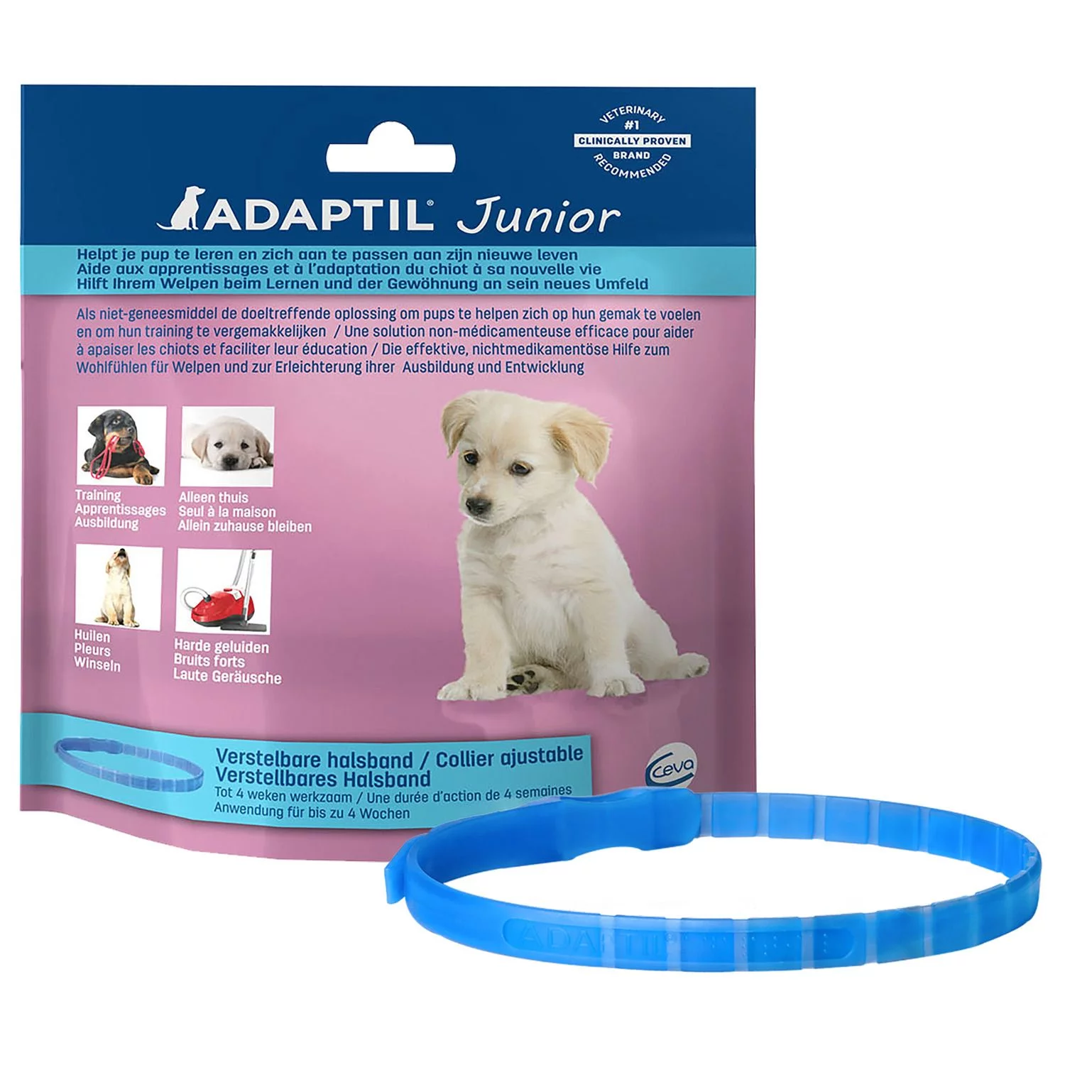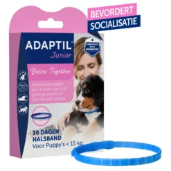 de ADAPTIL Junior halsband verspreidt “geruststellende boodschappen” om je pup te helpen zich op zijn gemak te voelen wanneer hij de wereld ontdekt, de regels leert die bij zijn nieuwe leven horen en om hem te helpen zich even goed te voelen in het gezin als bij zijn moeder. ADAPTIL Junior helpt je pup om zich meer op zijn gemak te voelen en meer zelfvertrouwen te krijgen tijdens de adoptieperiode en het helpt om zijn opvoeding / training makkelijker te laten verlopen. ADAPTIL Junior wordt aanbevolen vanaf de adoptie tot de leeftijd van 6 maanden. De verstelbare band dient permanent om de hals van de pup te zitten. Gebruik elke maand een nieuwe halsband.