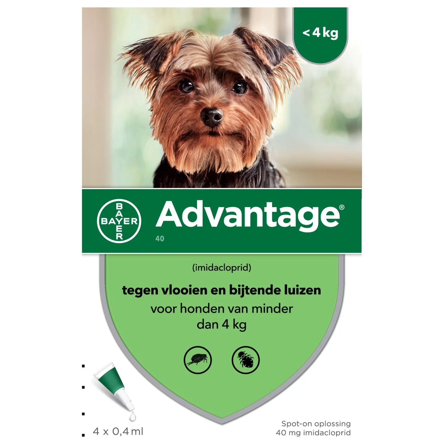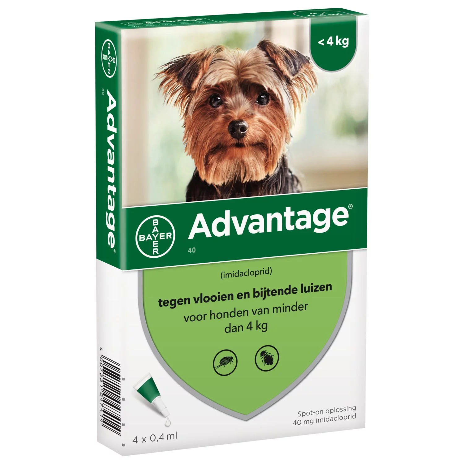 Gebruik Advantage nooit bij puppy’s jonger dan 8 weken. De werkzame stof is imidacloprid, dit middel komt niet in de bloedsomloop van je hond terecht, maar wordt opgenomen in de vettige laag van de huid en vacht. Advantage bevat 4 pipetten is verkrijgbaar in 4 varianten: