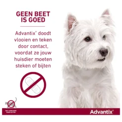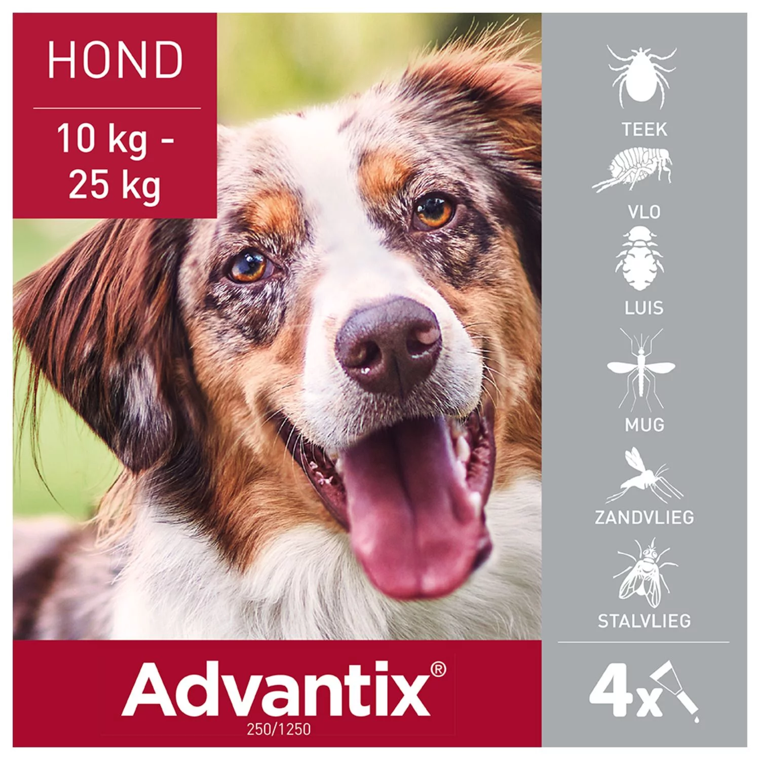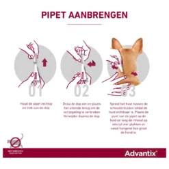 Het pipetje breng je aan in de nek van de hond, lees voor gebruik de bijsluiter. Het middel blijft ook effectief als je hond nat wordt. Advantix 250 is geschikt voor honden van 10 tot 25 kg. Heb je een hond zwaarder dan 25 kg? Kies dan voor Advantix 400 of 600. Als je hond lichter is dan 10 kg, kies dan voor Advantix 40 of 100. Gebruik Advantix nooit bij puppy’s jonger dan 7 weken. De werkzame stoffen zijn imidacloprid en permethrine.