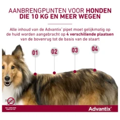 Het pipetje breng je aan in de nek van de hond, lees voor gebruik de bijsluiter. Het middel blijft ook effectief als je hond nat wordt. Advantix 40 is geschikt voor honden van tot 4 kg. Heb je een hond zwaarder dan 4 kg? Kies dan voor Advantix 100, 250, 400 of 600. Gebruik Advantix nooit bij puppy’s jonger dan 7 weken. De werkzame stoffen zijn imidacloprid en permethrine.