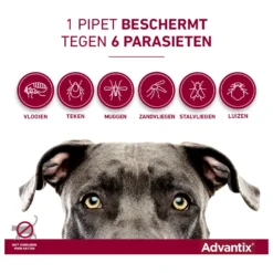 Honden kunnen last krijgen van veel verschillende parasieten, zoals vlooien en teken. Deze diertjes zijn vervelend voor jou en je dier, als je pech hebt kan je hond er zelfs ziek van worden. Een behandeling met een breedspectrum parasietenmiddel, zoals Advantix 400, geeft jouw hond de beste bescherming tegen ongewenste gasten. Advantix doodt vlooien, vlooienlarven en teken en werkt daarnaast afwerend tegen teken, muggen, zandvliegen en stalvliegen.