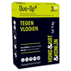 Wanneer er een vlooienplaag optreedt, is het altijd belangrijk dat je alle huisdieren in het huishouden tegelijk behandelt tegen vlooien. Heb jij een hond, kat en een konijn? Dan is Duo-Op een ideaal product waarmee je alle huisdieren in 1 keer kunt behandelen. Let uiteraard wel op dat je het juiste product voor elk huisdier koopt. Er zijn verschillende varianten voor hond, kat en konijn, verdeeld in gewichtsklassen.