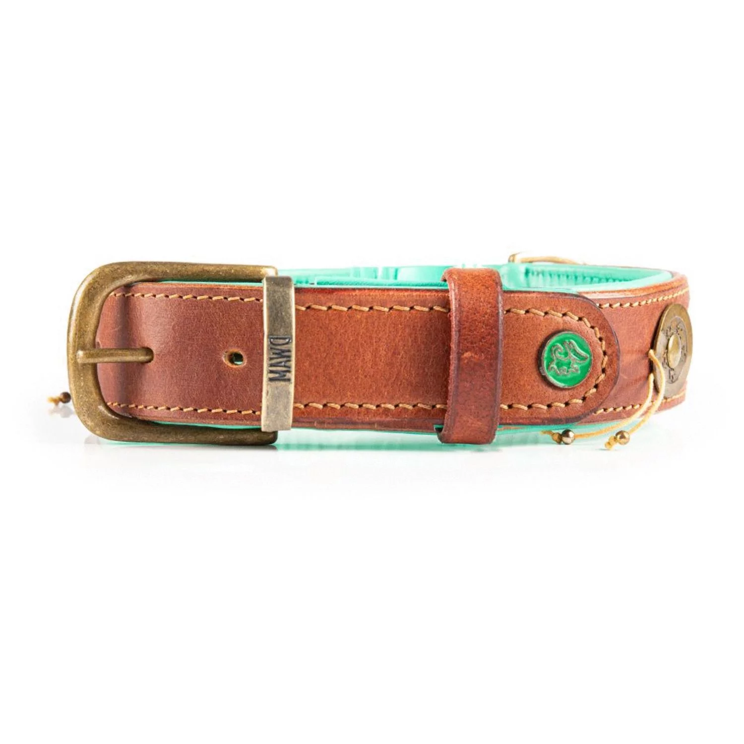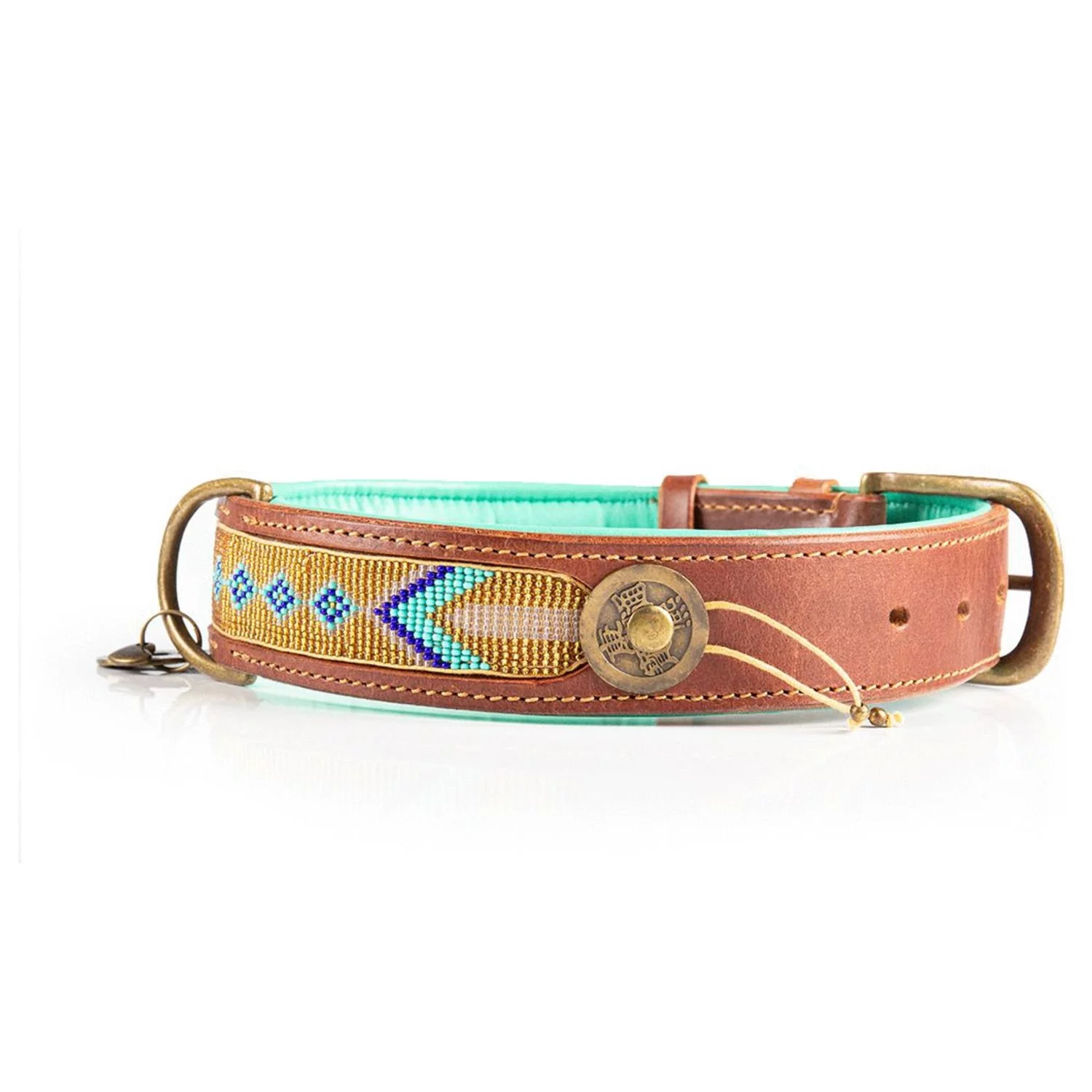 Wanneer je op pad gaat met je hond, wil je er natuurlijk wel flitsend uitzien. DWAM heeft een assortiment met prachtige riemen en halsbanden waarmee je hond er altijd stijlvol bij loopt. De Indi Moon van Dog With A Mission is een handgemaakte, oersterke halsband voor je viervoeter. De Indi Moon is gemaakt van leer met in combinatie met prachtige goud/turquoise kralen. De halsband wordt afgemaakt met een bedeltje.