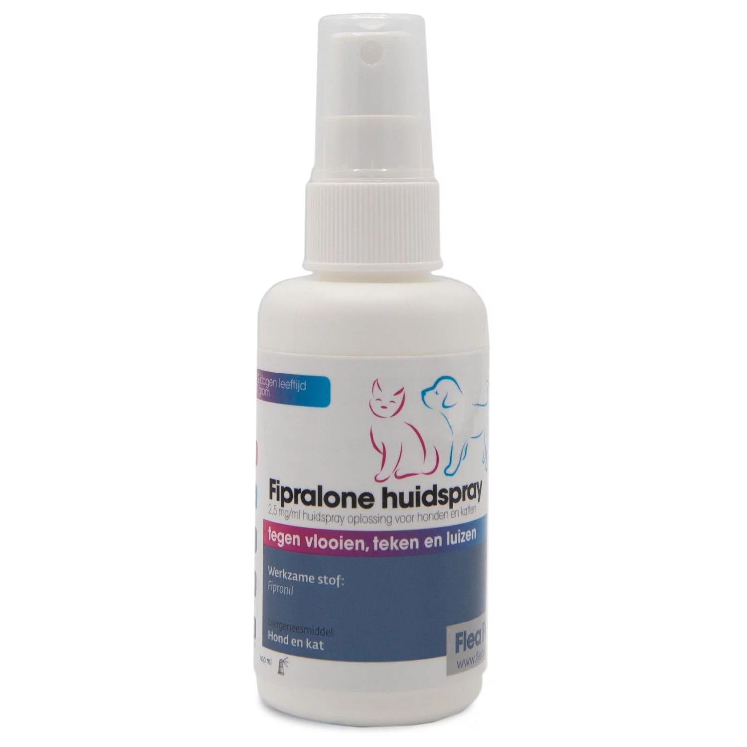 Vlooien, luizen en teken zijn irritante beestjes, ze jeuken en kriebelen en kunnen ook nog vervelende ziektes met zich mee dragen. Als je hond of kat er last van heeft, wil je ze dan ook zo snel mogelijk bestrijden. De Flea Free Huidspray helpt hierbij! Het is een teken- en vlooienspray met de werkzame stof Fipronil. Dit product heeft dezelfde werking als de Frontline spray. Na toediening van deze spray op de huid van jouw hond of kat is hij beschermt tegen vlooien (3 maanden bij honden en 6 weken bij katten) en teken (tot 4 weken). Daarnaast behandelt de huidspray ook infestaties met bijtende luizen.