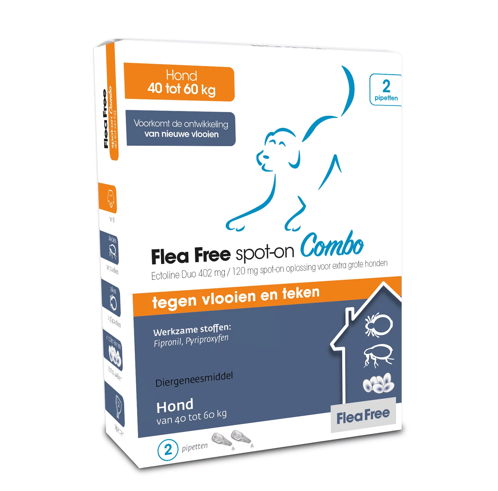 Voorkomen is beter dan genezen, zo ook met vlooien. Deze diertjes zijn vervelend en kunnen erg jeuken, als je niet uitkijkt vormen ze zelfs een hele plaag. Ook bestaande vlooien (en teken) wil je natuurlijk zo snel mogelijk bestrijden. Flea Free Spot-on Combo is een vlooien- en tekenpipet met de werkzame stoffen Fipronil en Pyriproxyfen. Deze vlooien- en tekenpipetten hebben dezelfde werking als Frontline spot-on Combo. Na toediening van deze handige drop-stop pipet is jouw hond of kat beschermd tegen vlooien (tot 7 weken bij honden en tot 5 weken bij katten) en teken (tot 4 weken bij honden en tot 1 week bij katten). De werkzame stof Fipronil doodt binnen 24 uur de aanwezige vlooien en binnen 48 uur de aanwezige teken op het dier. De werkzame stof Pyriproxyfen doet zijn werking in huis (de omgeving). Het voorkomt de ontwikkeling van vlooienlarven en -eieren in de omgeving. Zo voorkom je de ontwikkeling van een ernstige vlooienplaag.