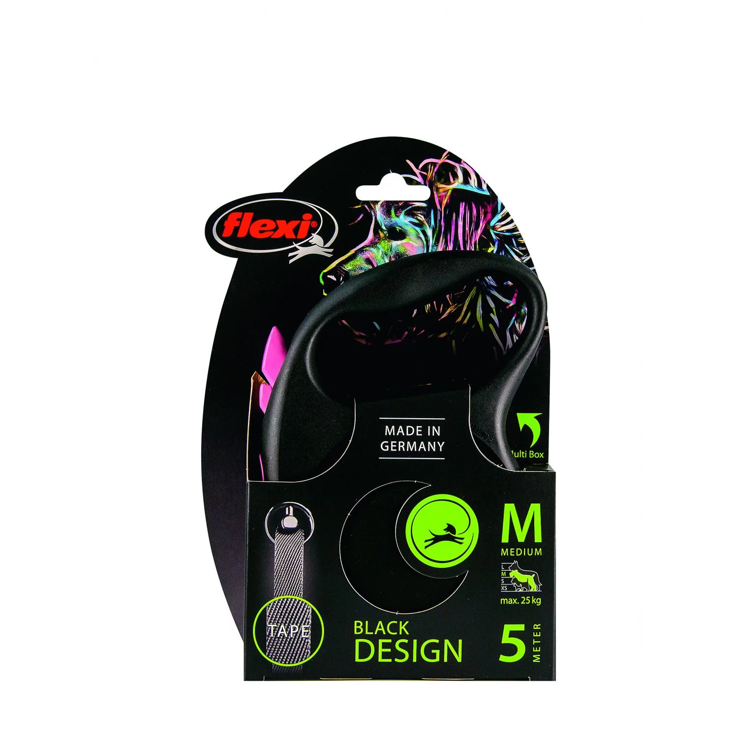 Het is mogelijk om de Black Design M Tape uit te breiden met de Flexi Multi Box (poepzakjes- of snackhouder). De lijn is verkrijgbaar in verschillende maten, afhankelijk van het gewicht van je hond. De Black Design-lijn bevat zwarte rollijnen met opvallende, gekleurde accenten.