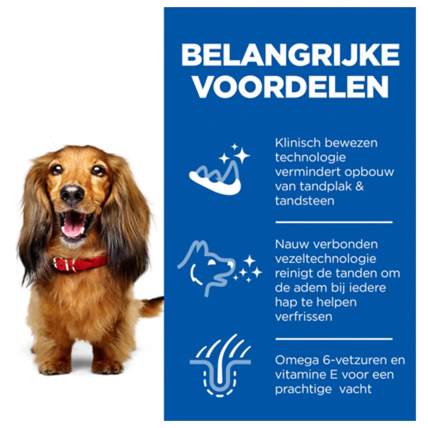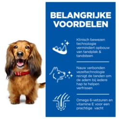 Een goede mondhygiëne is van groot belang voor je hond. Als je niks doet aan de verzorging van het gebit, kan er tandplak en tandsteen vormen wat op den duur pijnlijk en zelfs gevaarlijk kan zijn. Hill’s Science Plan Adult Oral Care Medium Kip zijn droge hondenbrokken die een klinisch bewezen technologie bevatten om de opbouw van tandplak en -steen te verminderen.