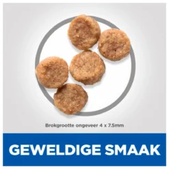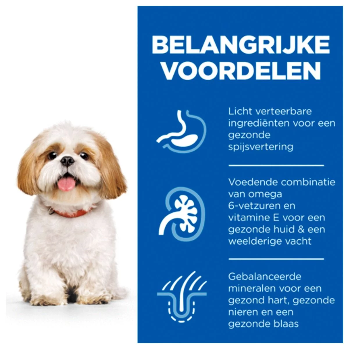 De brok met kip bevat omega 6-vetzuren en vitamine E voor een mooie huid en vacht. Ook bevat het gebalanceerde mineralen voor de gezondheid van hart, blaas en nieren. De makkelijk verteerbare ingrediënten zorgen voor een gezonde spijsvertering. Als laatste zorgt de speciale Small & Mini antioxidantenmix voor een levenslange ondersteuning van het immuunsysteem. De brokken bevatten geen kunstmatige kleur-, smaak- en conserveringsmiddelen.