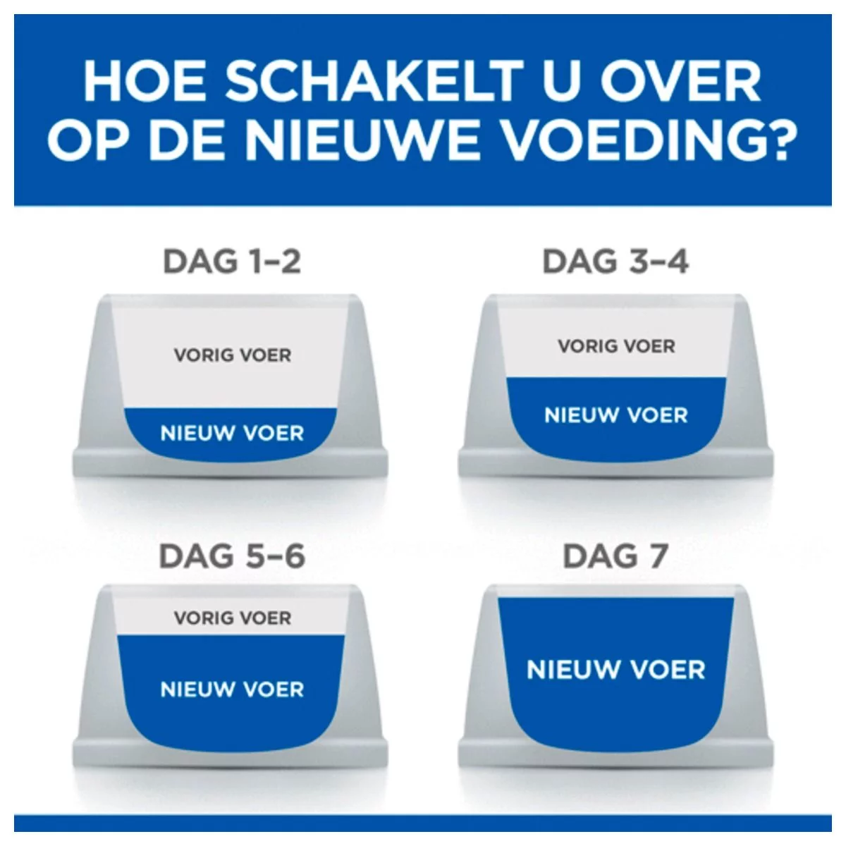 - Pas de hoeveelheid brokjes aan om het ideale gewicht te behouden, indien nodig in overleg met een dierenarts