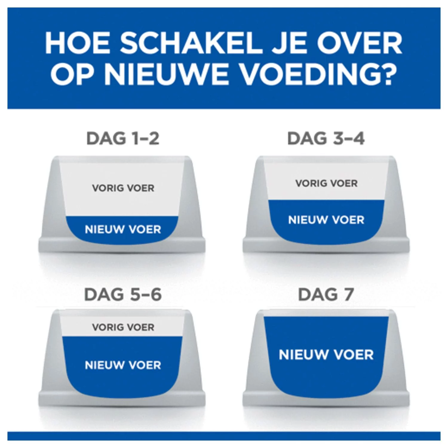 - Pas de hoeveelheid brokjes aan om het ideale gewicht te behouden, indien nodig in overleg met een dierenarts