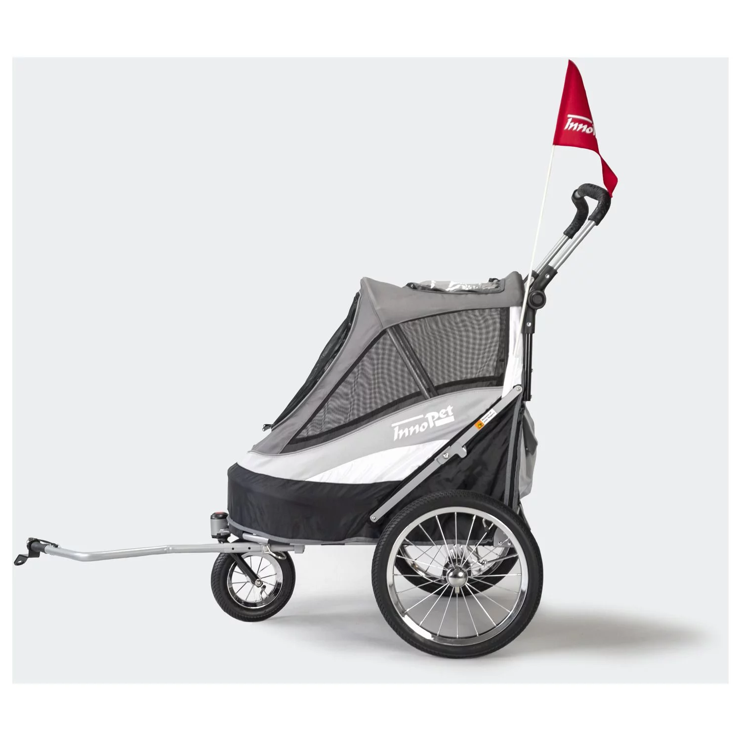Hoewel honden het leuk vinden om mee te rennen naast de fiets, is dit niet voor elke hond (meer) mogelijk. Ook voor lange afstanden is het niet wenselijk dat je hond de hele weg mee rent. Door gebruik te maken van de Sporty Dog Trailer Deluxe van InnoPet kan je je hond altijd meenemen. De Sporty Dog Trailer Deluxe is een fietsaanhanger en buggy in 1.