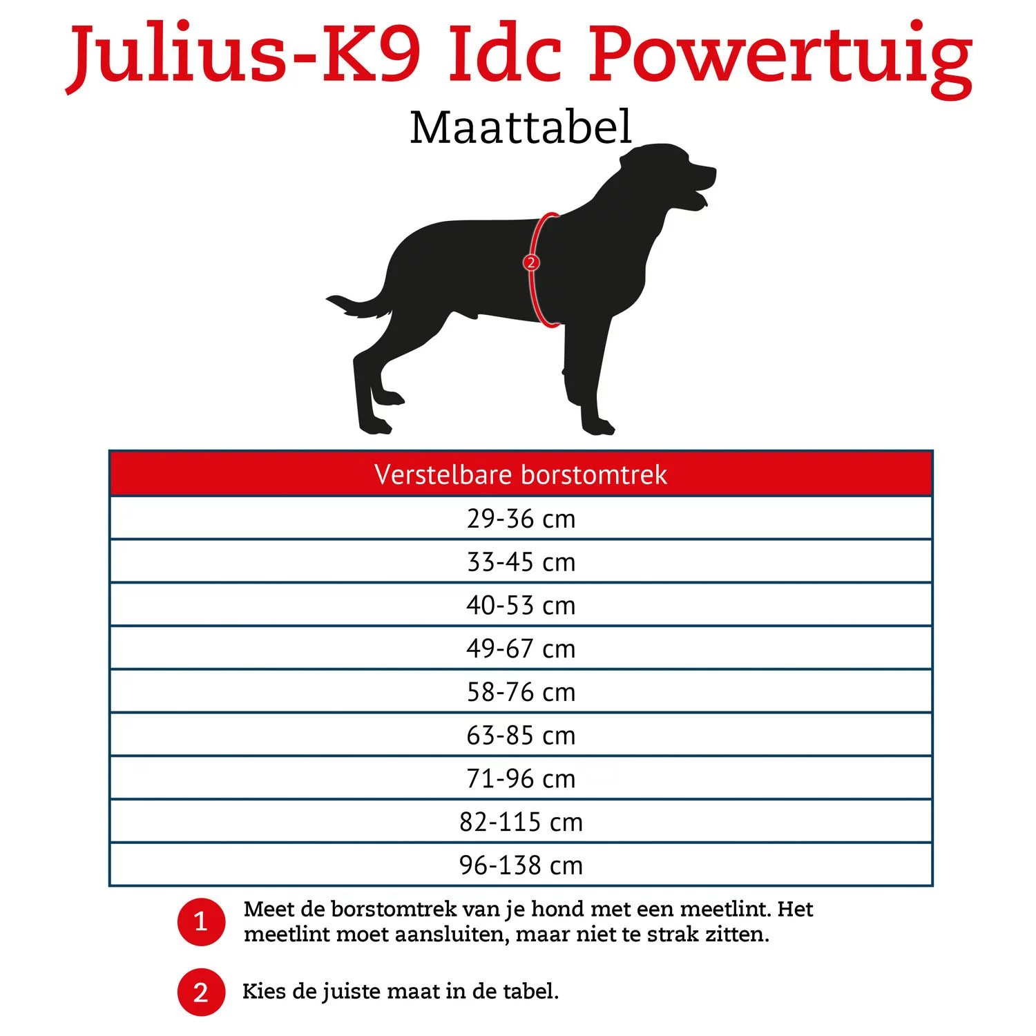 De Julius-K9 IDC Powertuigen zijn verkrijgbaar in meerdere maten, waarbij wordt uitgegaan van de borstomvang en het lichaamsgewicht: