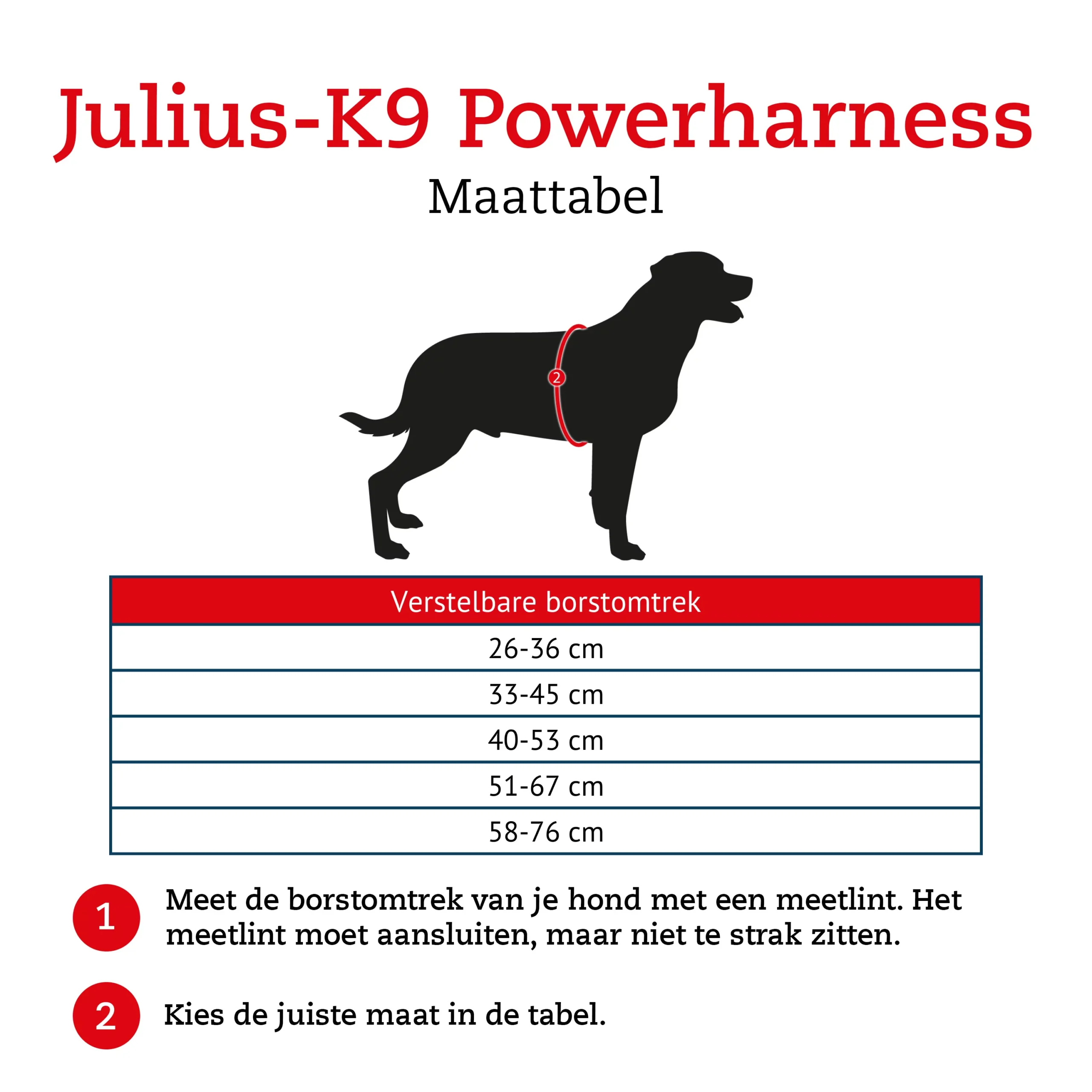 De Julius-K9 Powertuigen zijn verkrijgbaar in meerdere maten, waarbij wordt uitgegaan van de buikomvang en het lichaamsgewicht: