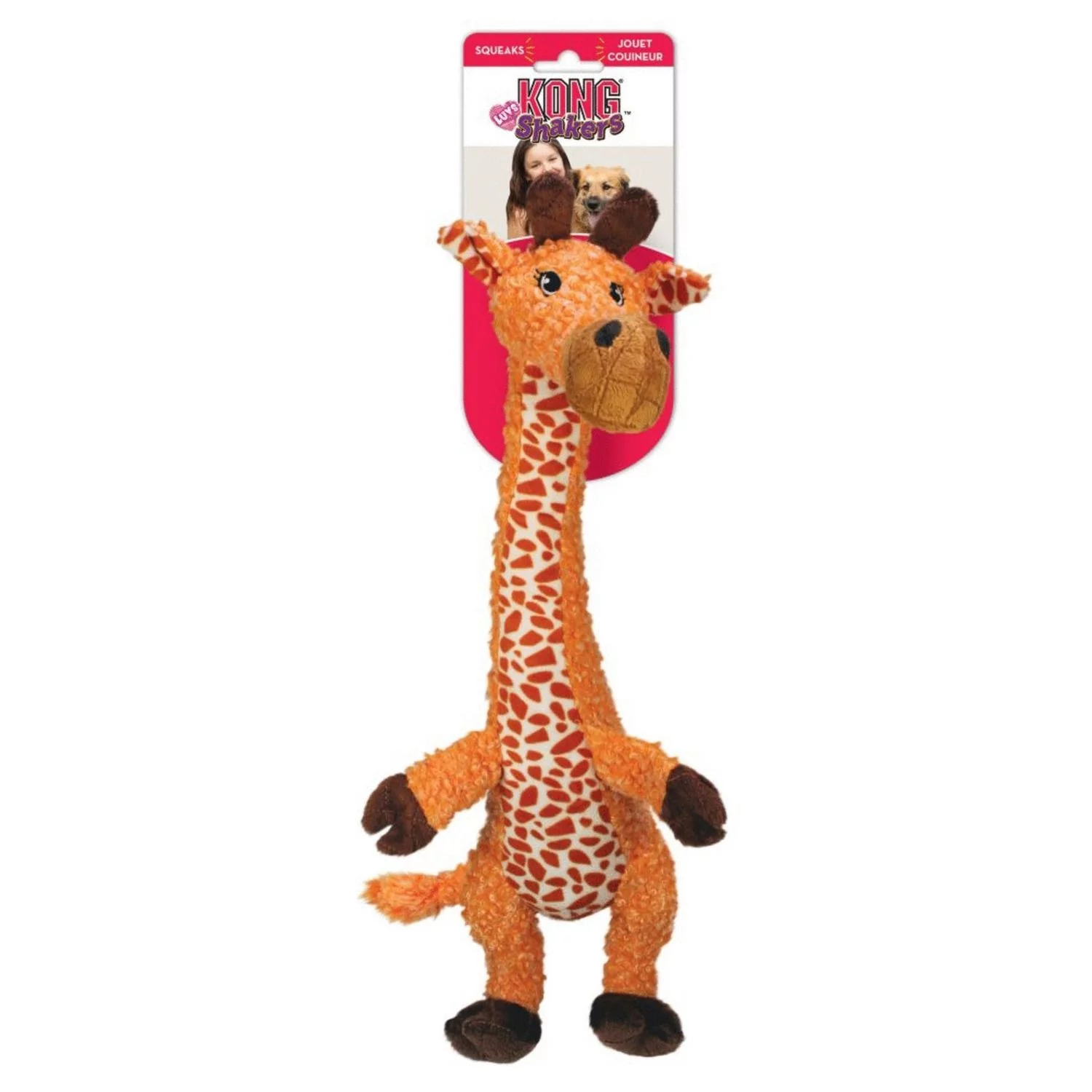 De Kong Shakers luvs Giraffe heeft een uniek lang lichaam en is gemaakt van sterker pluche stof waardoor de hond er veel en woest mee kan spelen. Het verlengde lichaam zorgt voor veel speelplezier. De piep welke in het speeltje zit is verlaagd waardoor deze minder hard klinkt. Het speeltje heeft een totale lengte van 48cm.