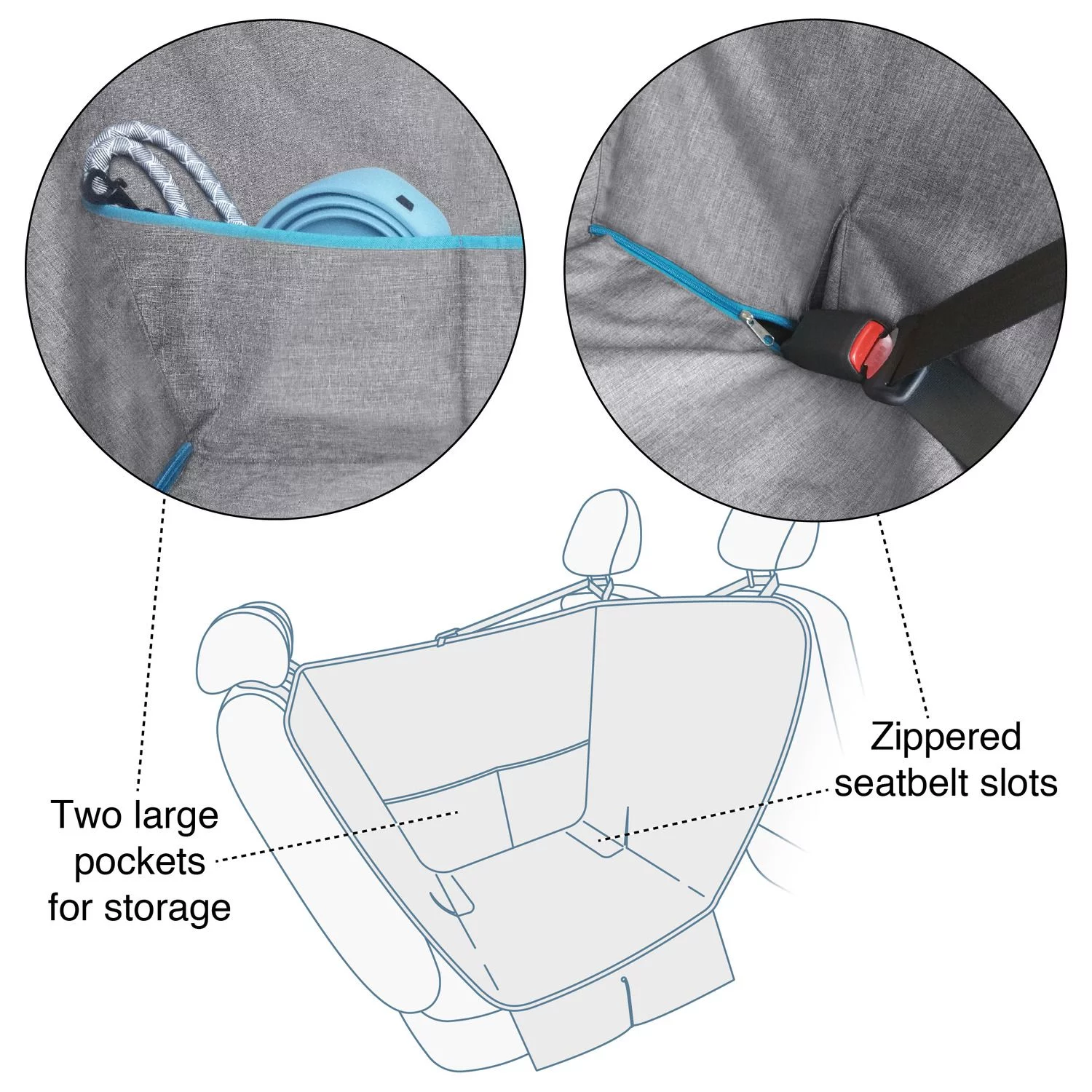 Het handige van deze hoes is, is dat de helft van de achterbank maar bezet is. Je hebt dus nog gewoon ruimte hebt voor niet-harige gasten. De waterdichte, vlekbestendige 400D polyester stof houdt je stoelen beschermd en door de opening in de hoes kan je alsnog gemakkelijk bij de gordels komen. De autohoes voor je hond wordt bevestigd aan alle vier de hoofdsteunen van de auto. Vijf extra verbindingspunten garanderen een veilige pasvorm.