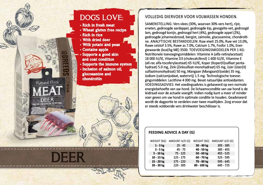 Je wilt je hond natuurlijk het beste voer aanbieden. De Natural Fresh Meat All Breeds is super premium droogvoer met vers hert voor alle volwassen hondenrassen. De voer is ook zeer geschikt voor honden met eiwit intolerantie. De voeding bevat veel vers vlees en er zijn geen bijproducten toegevoegd, zoals botten of slachtafval.
