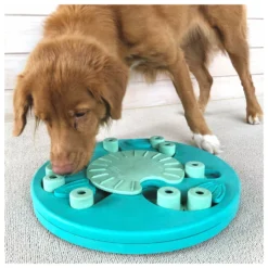 De hondenpuzzel heeft de kleur mintgroen en bevat verschillende soorten compartimenten waar je snoepjes in kunt verstoppen. Met de schuifjes in de vorm van flippers en de grote draaischijf kan je een aantal compartimenten afdekken. Doordat er verschillende mogelijkheden zijn om snoepjes te verstoppen, kan je het steeds een beetje moeilijker maken voor je hond! Hierdoor is het geschikt voor zowel beginners als gevorderden. Laat eerst zien aan je hond waar je de snoepjes hebt verstopt en het speuren kan beginnen!