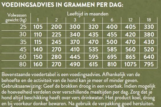 Ons voedingstabel op de verpakking is een voedingsadvies. Afhankelijk van de behoefte en de activiteit van de hond kan je meer of minder geven. Gebruiksaanwijzing: Geef de brokken droog in een voerbak. Indien mogelijk de hoeveelheid verdelen over verschillende maaltijden per dag. Zorg dat je hond altijd beschikking heeft over vers drinkwater. Het product koel, droog en bij voorkeur donker bewaren.