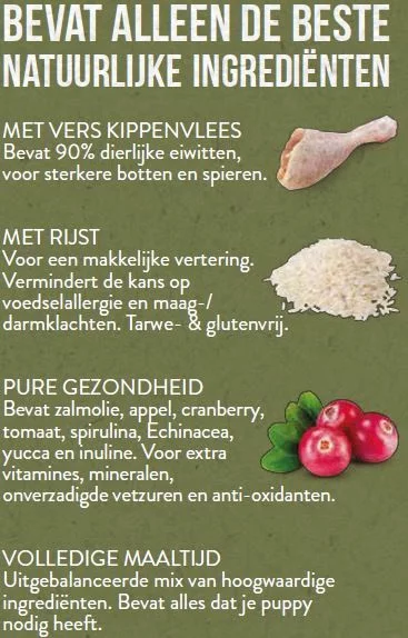 Deze voeding is geschikt voor puppy’s tot 18 maanden oud en die later grote honden worden met een gezond volwassen gewicht van 25 kg of meer.