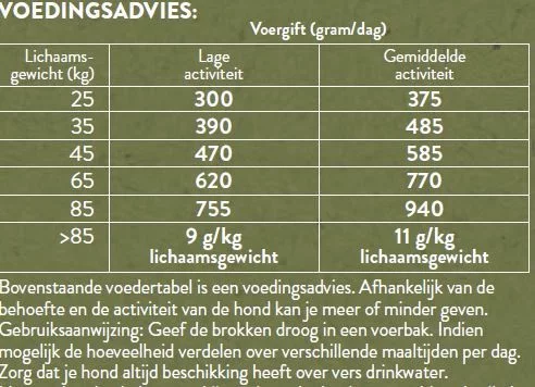 Ons voedingstabel op de verpakking is een voedingsadvies. Afhankelijk van de behoefte en de activiteit van de hond kan je meer of minder geven. Gebruiksaanwijzing: Geef de brokken droog in een voerbak. Indien mogelijk de hoeveelheid verdelen over verschillende maaltijden per dag. Zorg dat je hond altijd beschikking heeft over vers drinkwater. Het product koel, droog en bij voorkeur donker bewaren.