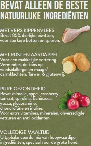 Uitgebalanceerde mix van hoogwaardige ingrediënten. Dit voer bevat alles dat je hond nodig heeft.