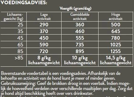 Ons voedingstabel op de verpakking is een voedingsadvies. Afhankelijk van de behoefte en de activiteit van de hond kan je meer of minder geven. Gebruiksaanwijzing: Geef de brokken droog in een voerbak. Indien mogelijk de hoeveelheid verdelen over verschillende maaltijden per dag. Zorg dat je hond altijd beschikking heeft over vers drinkwater. Het product koel, droog en bij voorkeur donker bewaren.