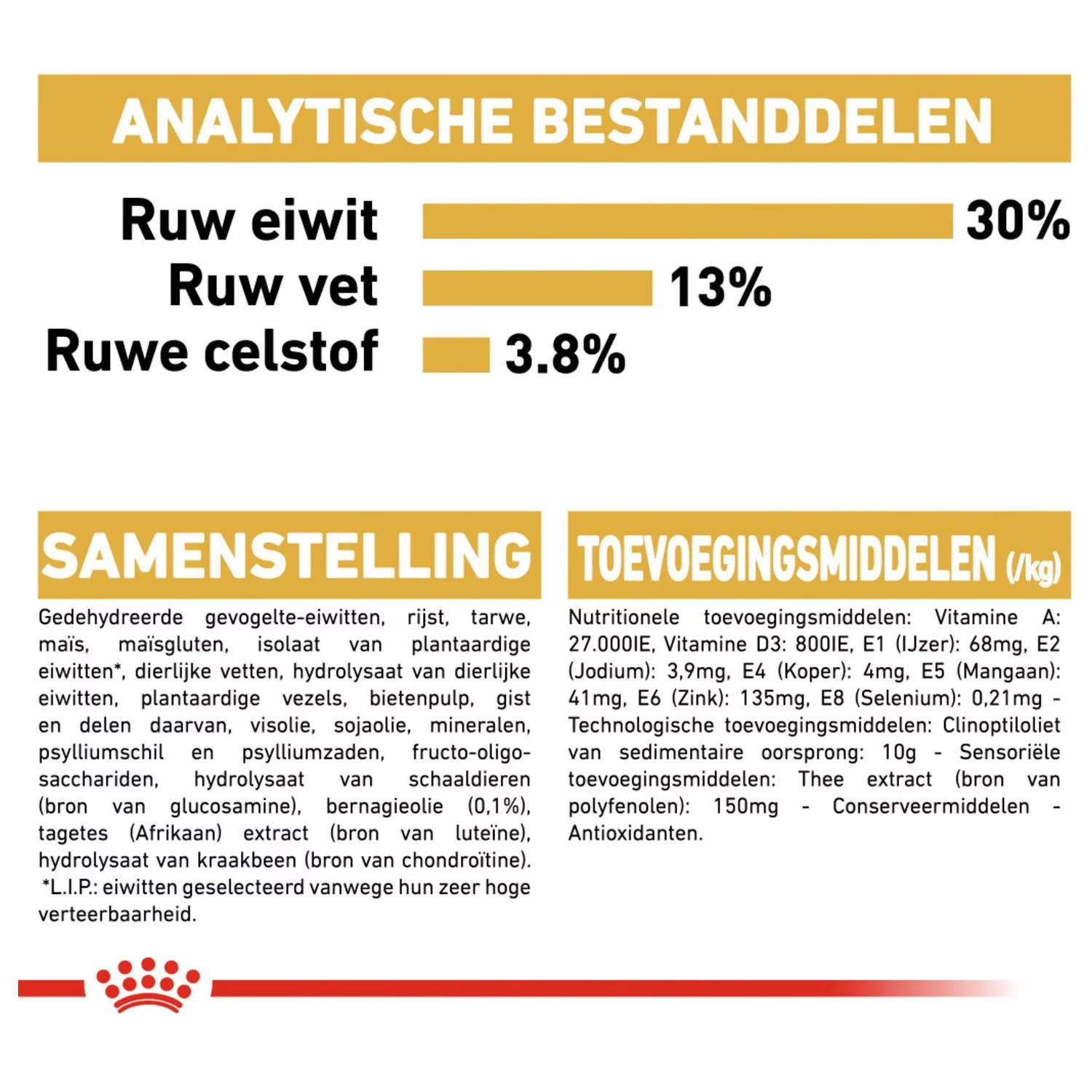 Royal Canin Labrador Retriever Adult helpt bij de ondersteuning van gezonde botten en gewrichten. Verrijkt met EPA en DHA. Daarnaast zijn de brokken speciaal ontwikkeld voor de kaken van de Labrador Retriever. De speciaal aangepaste vorm van de brokken helpt de eetsnelheid vertragen en helpt je Labrador zijn ideale gewicht te behouden.