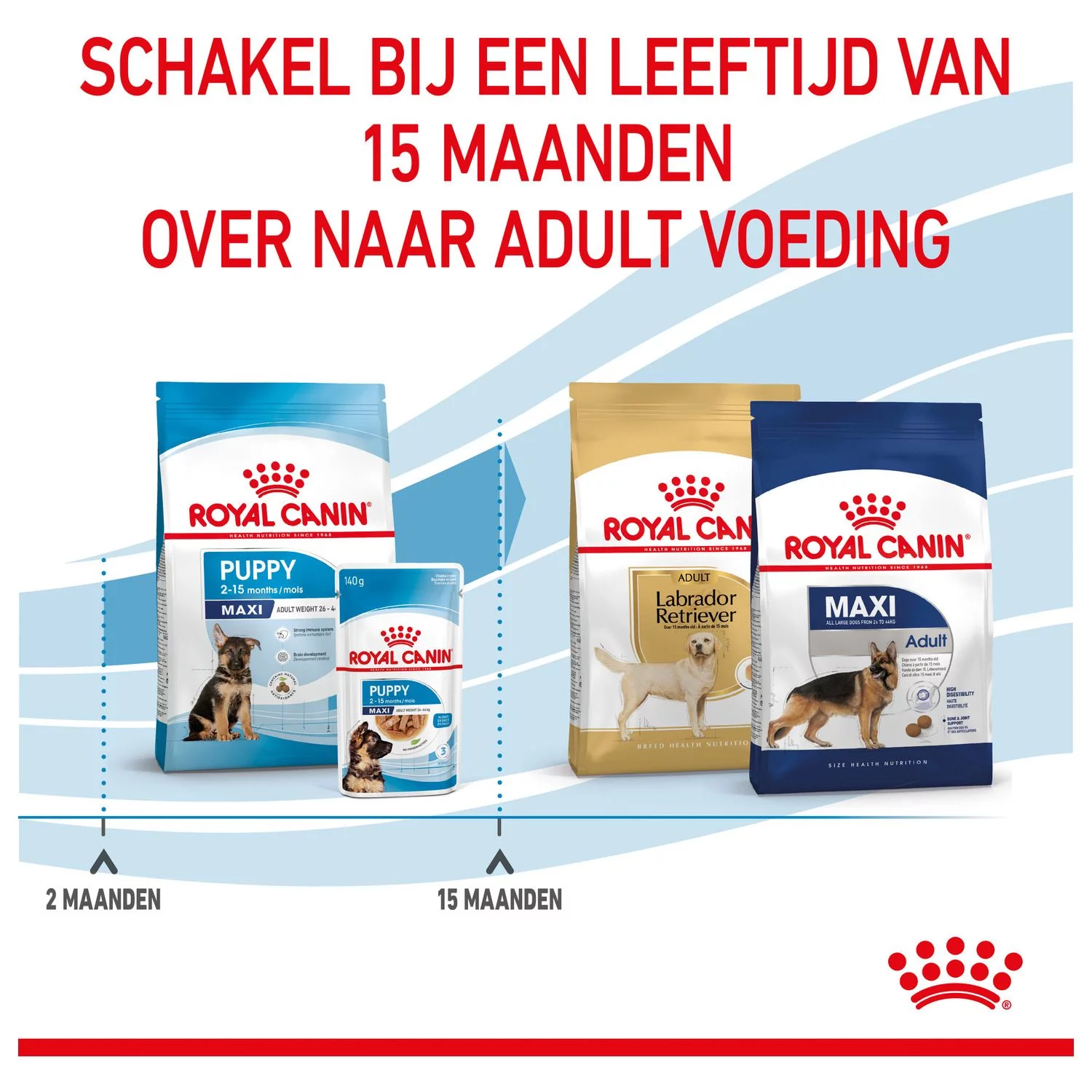 Royal Canin Maxi Puppy is speciaal ontwikkeld met de voedingsbehoeften van een pup van een groot ras (22 tot 44 kg wanneer volwassen) in het achterhoofd. De brokken zijn geschikt voor puppy’s van 2 tot 15 maanden oud.