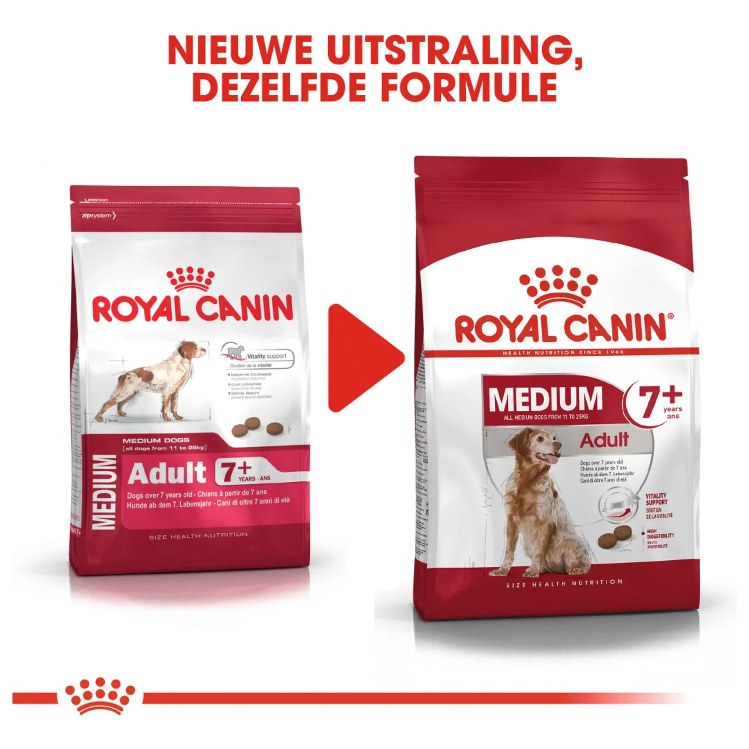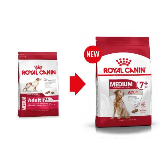 Royal Canin Medium Adult 7+ is verkrijgbaar in 4 kg, 10 kg en 15 kg.