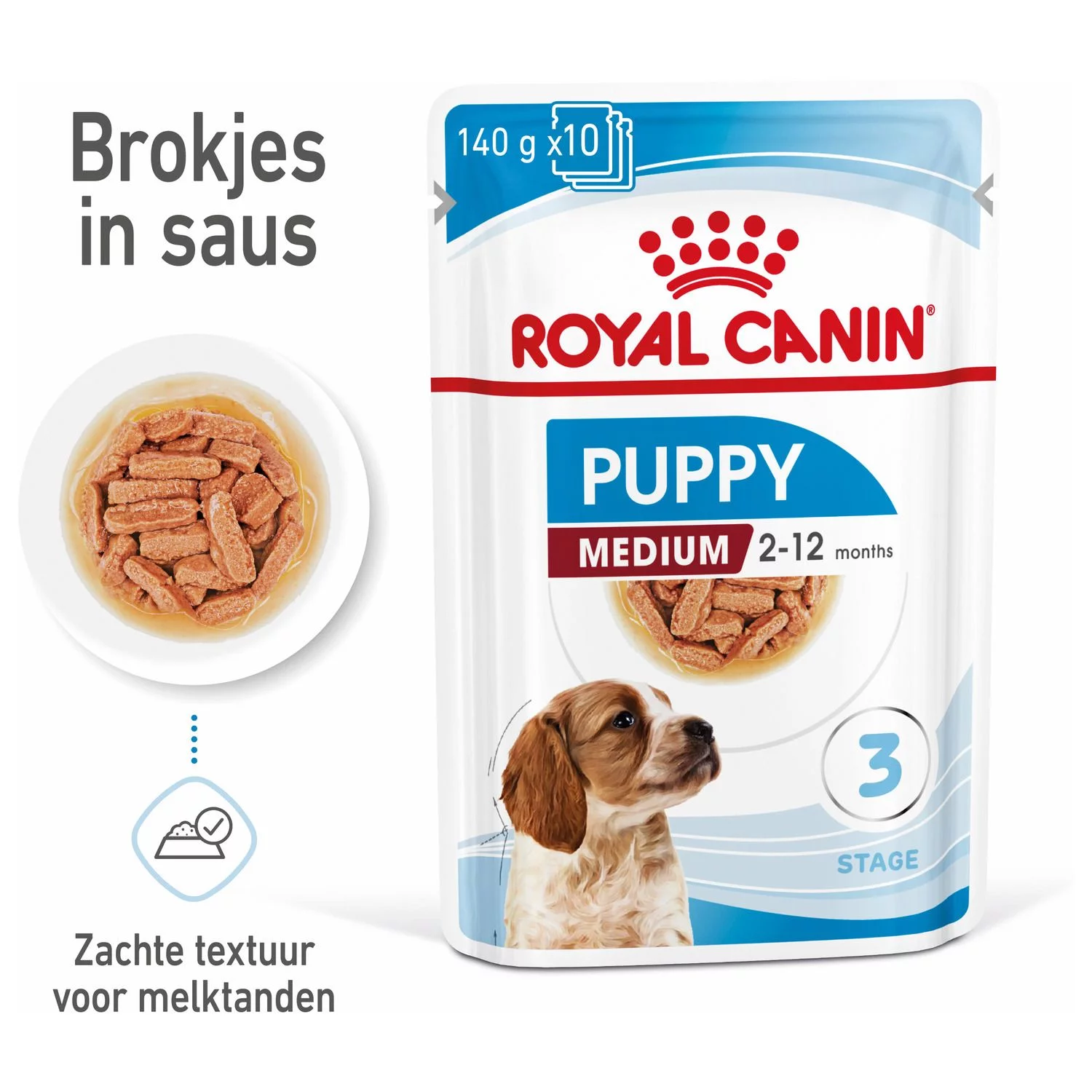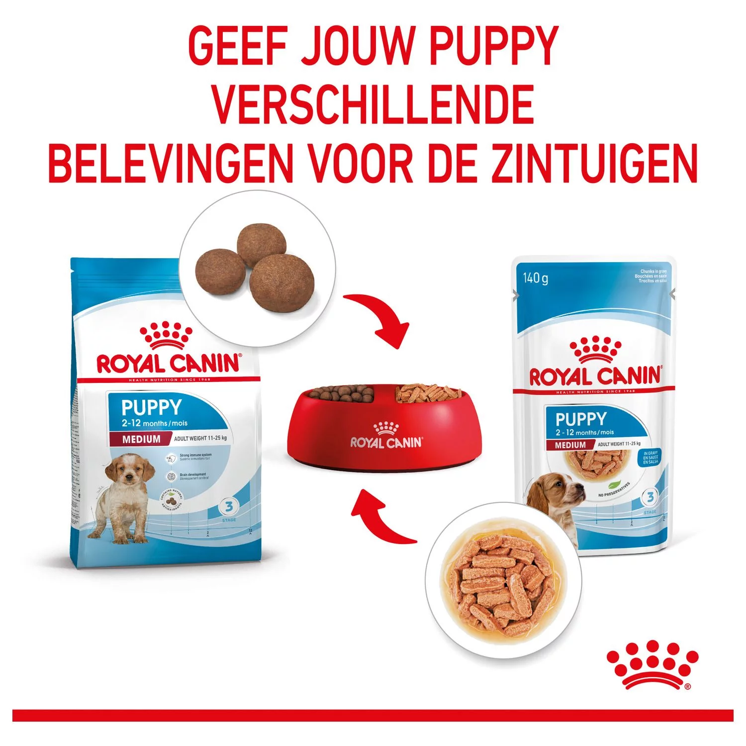 Zelfs de meest kieskeurige pups zullen smullen van Royal Canin Medium Puppy in Saus. De natvoeding biedt een fijne zintuigelijke ervaring, hydrateert het lichaam en kan daardoor ook perfect gecombineerd worden met de brokken van Royal Canin Medium Puppy.
