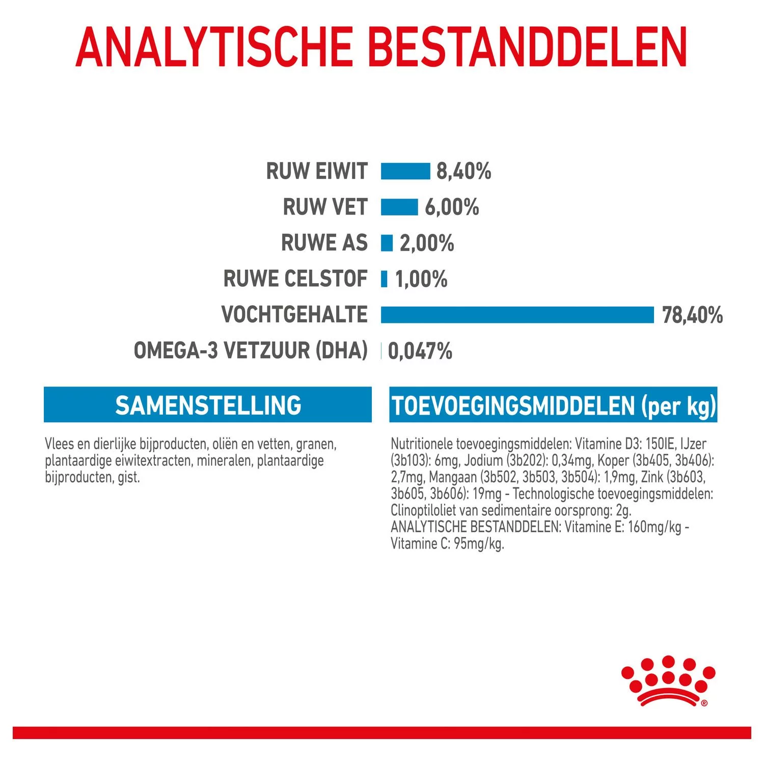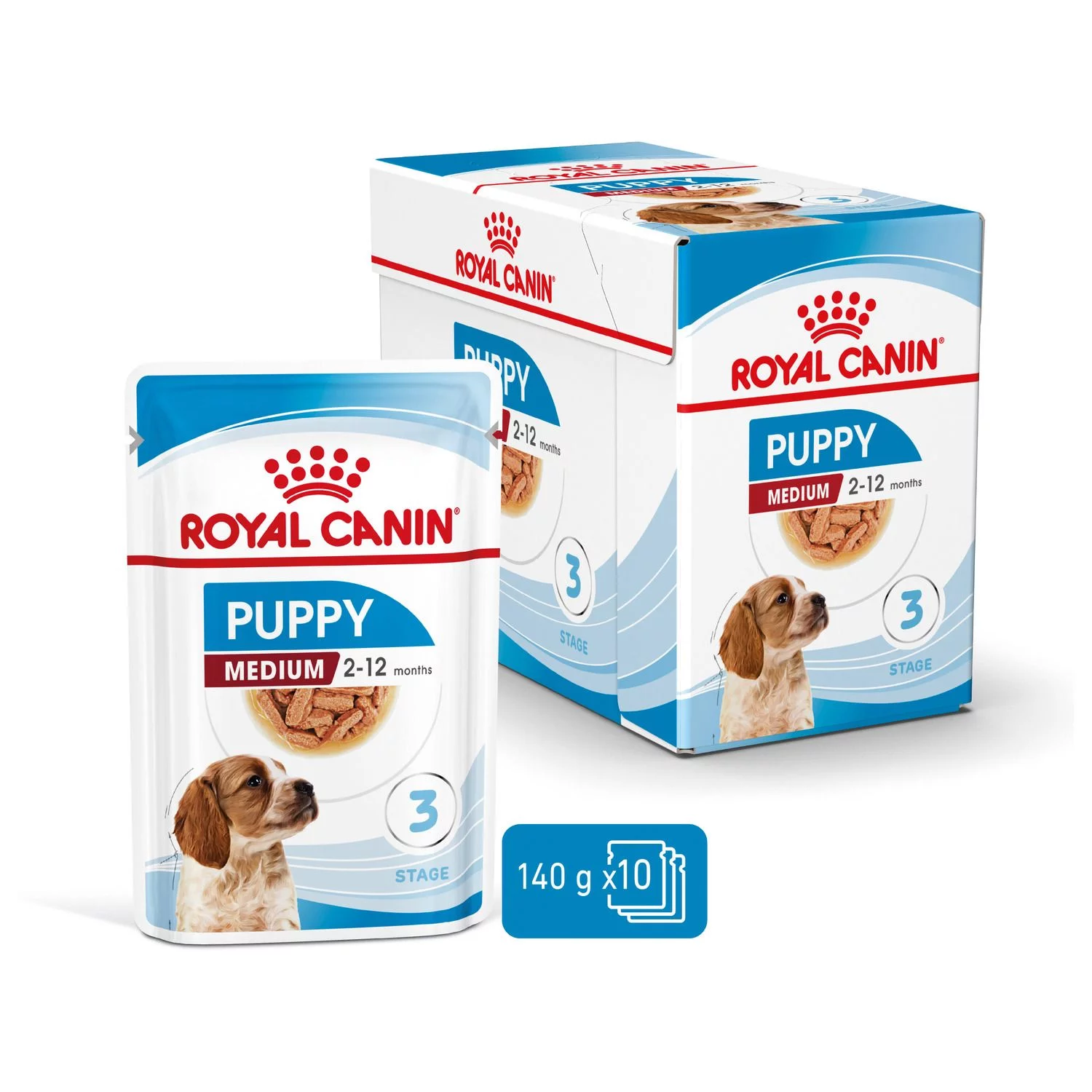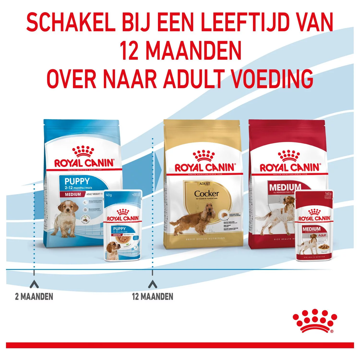 Royal Canin Medium Puppy Wet is speciaal ontwikkeld met de voedingsbehoeften van een pup van een middelgroot ras (11 tot 25 kg wanneer volwassen) in het achterhoofd. De voeding is geschikt voor puppy’s van 2 tot 12 maanden oud. De natvoeding bevat heerlijke stukjes vlees verwerkt in een smakelijke saus.