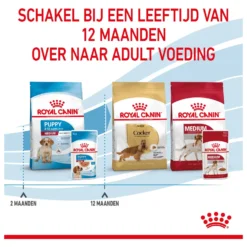 Wanneer je pup rond de 12 maanden oud is, zullen zijn voedingsbehoeftes weer veranderen. Je hond heeft dan een voeding nodig die past bij de volwassen hond. Het is dan ook aan te raden om op een leeftijd van anderhalf tot twee jaar over te stappen op producten voor volwassen honden van Royal Canin; zoals Royal Canin Medium Adult.