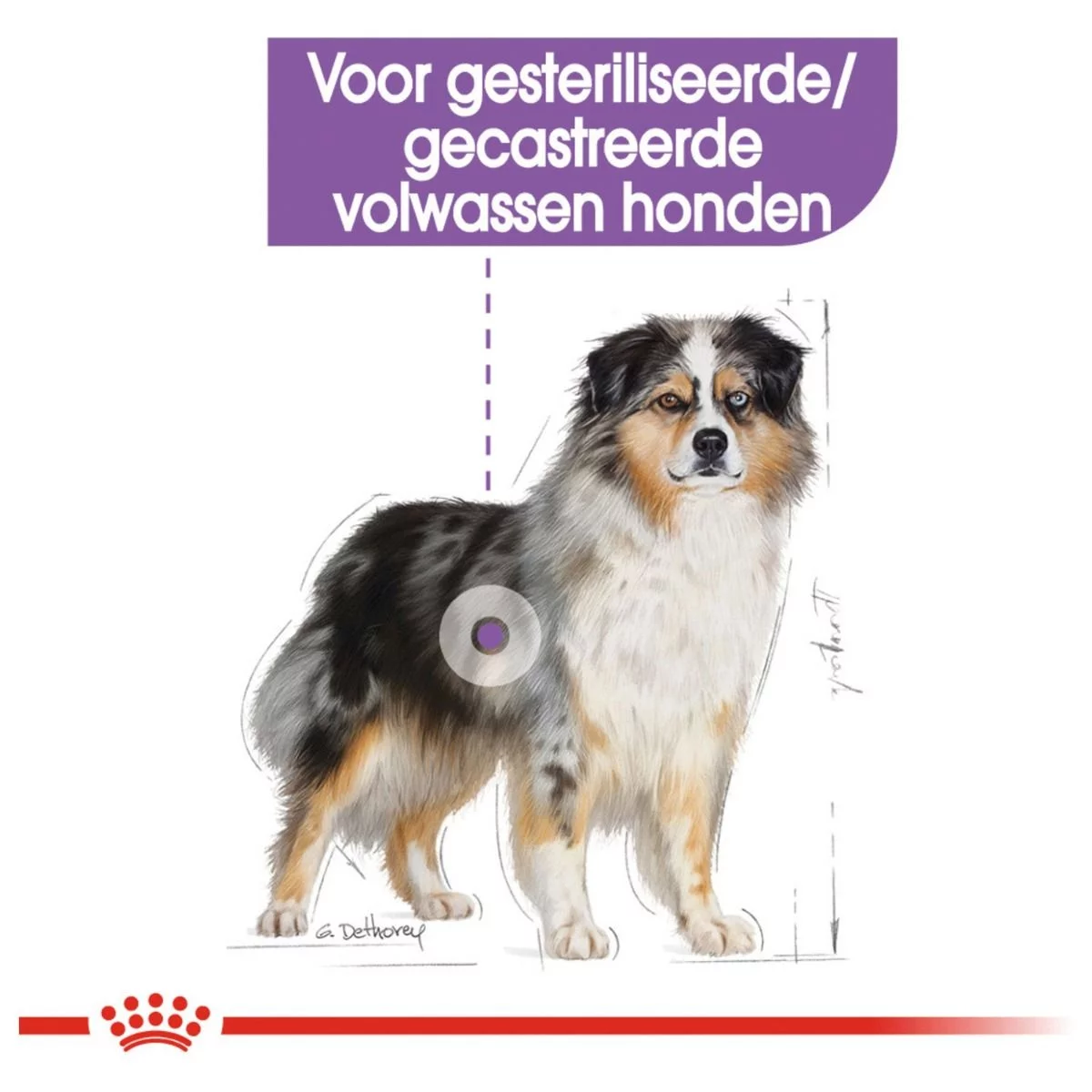 Na een sterilisatie of een castratie zal je hond minder calorieën verbruiken omdat hij liever lekker op de bank ligt dan het avontuur op te zoeken, terwijl zijn eetlust onveranderd hoog blijft. Sterilised Medium is samengesteld met minder vet en helpt je hond lichtvoetig te blijven.