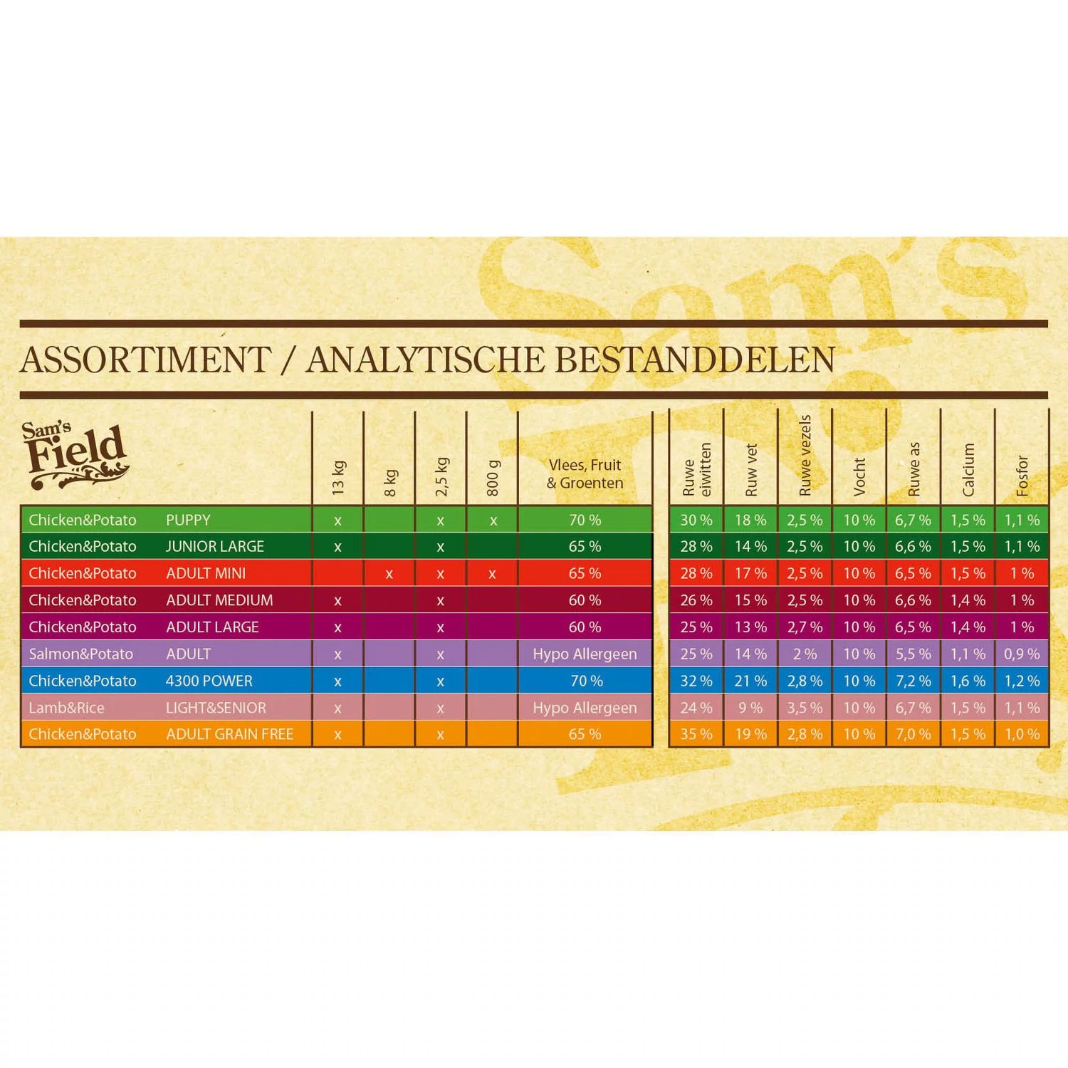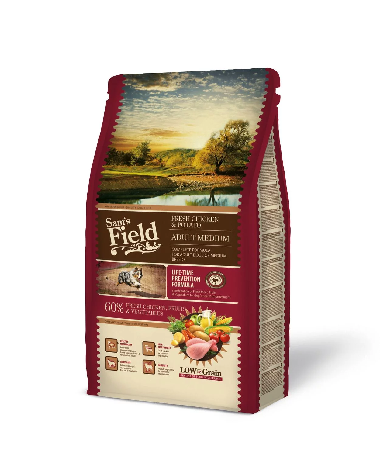 Sam’s Field Adult Medium Chicken & Potato is verkrijgbaar in 2,5 en 13 kg.