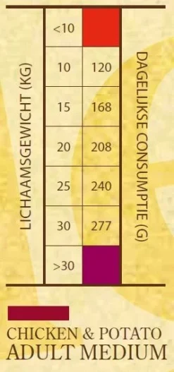De brokken bevatten wel 60% kip, fruit en groenten! Deze voeding is geschikt voor volwassen honden van 10 tot 30 kg. Adult Medium Chicken & Potato in een notendop: