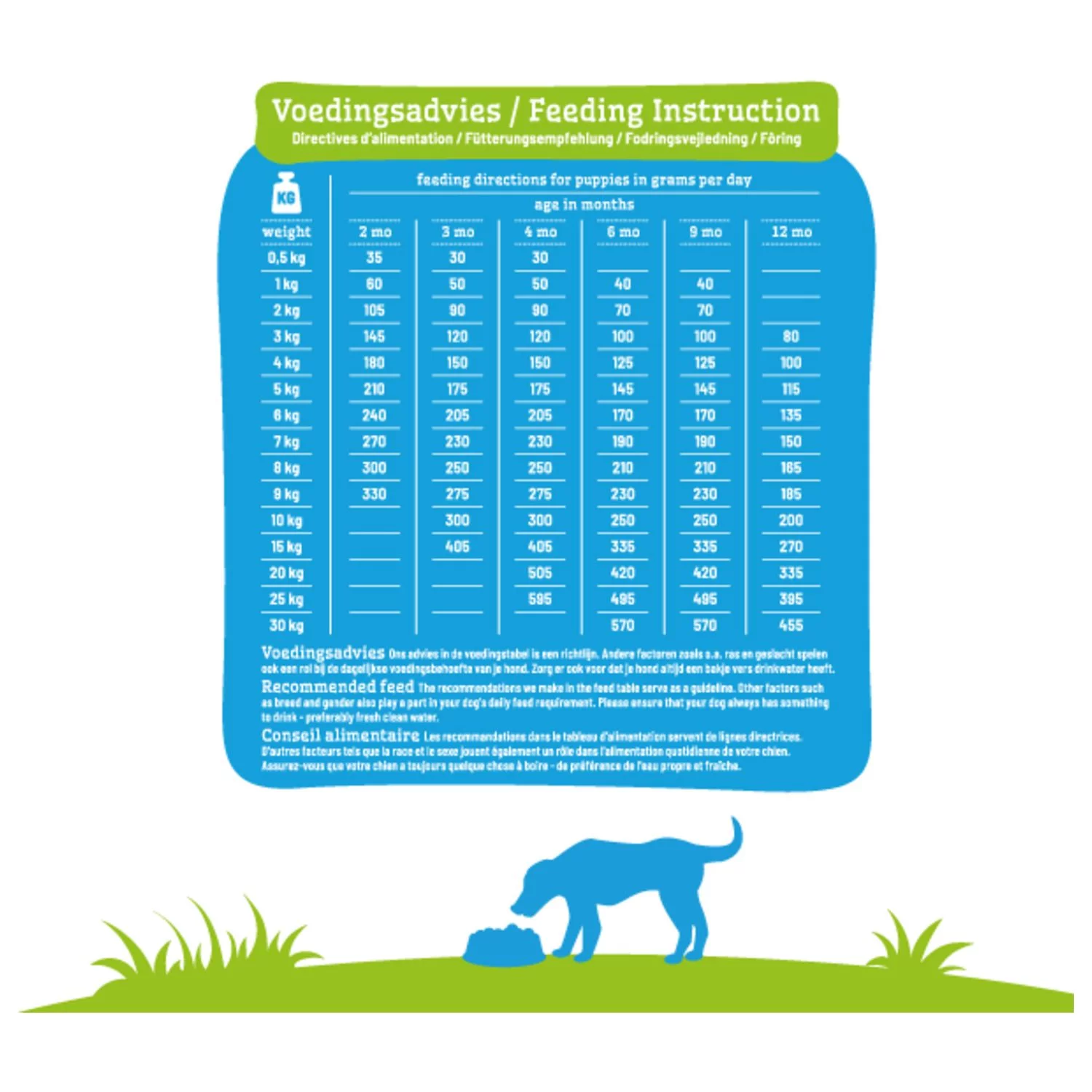 Een gezonde pup is actief en speels en moet natuurlijk nog veel groeien. Daarom bevatten deze brokken genoeg energie zodat je pup goed kan groeien en spelenderwijs de wereld kan ontdekken. Door het toevoegen van extra vitamines en bèta-glucanen wordt het nog kwetsbare immuunsysteem ondersteund, daarnaast zorgen vezels voor een gezonde spijsvertering. Dankzij de optimale calciumfosforverhouding ontwikkelt je pup een sterk en gezond gebit en skelet. Zo heeft je jonge hond gegarandeerd een gezonde start van zijn leven!
