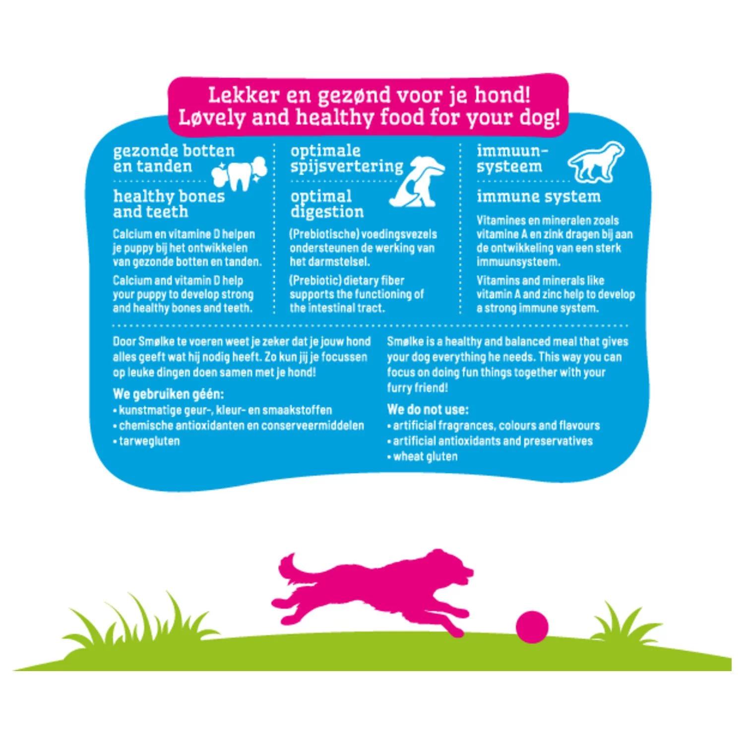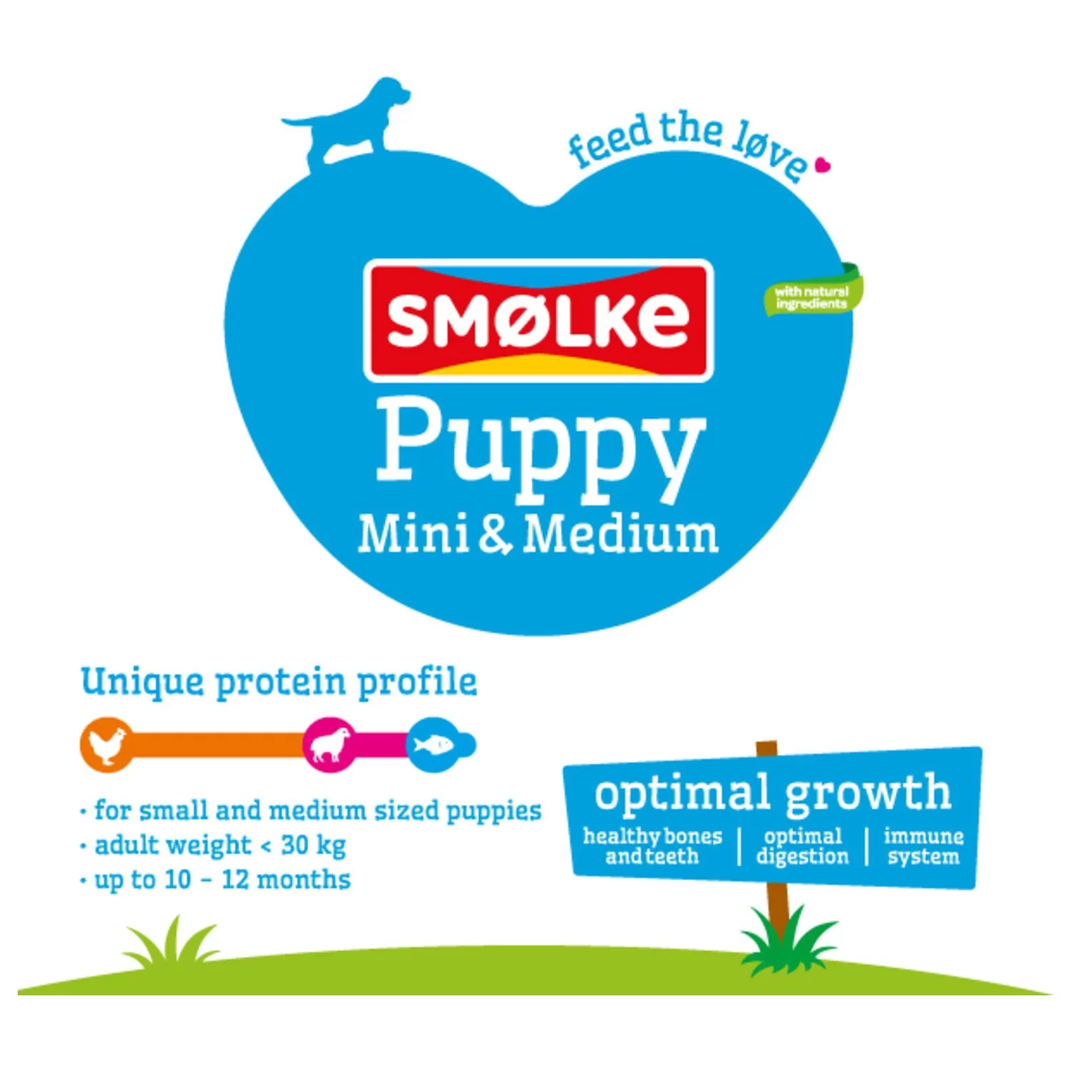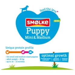Een complete puppyvoeding met natuurlijke ingrediënten wat elke dag weer zorgt voor een blije en tevreden hond, dat is Puppy Mini-Medium hondenvoeding van Smølke. Dit hondenvoer voor je kleine tot middelgrote puppy (lichter dan 30 kg wanneer volwassen) bevat alles wat hij nodig heeft om iedere dag in balans te zijn. Het voer is geschikt voor puppy’s tot 10 à 12 maanden oud.
