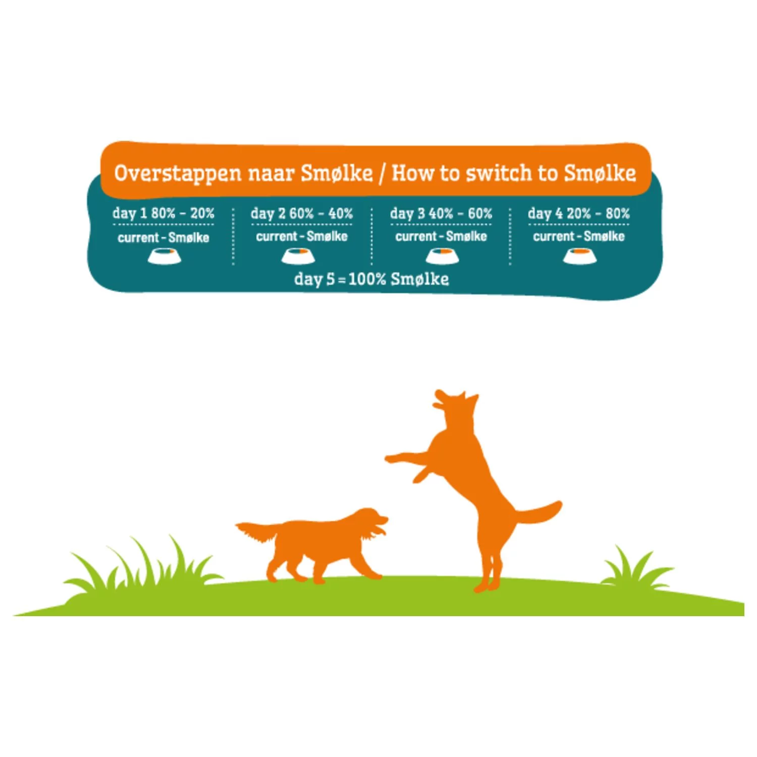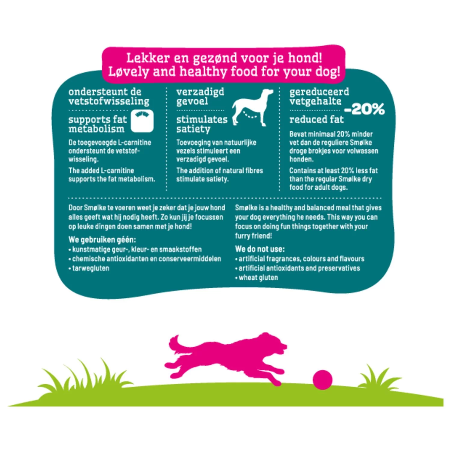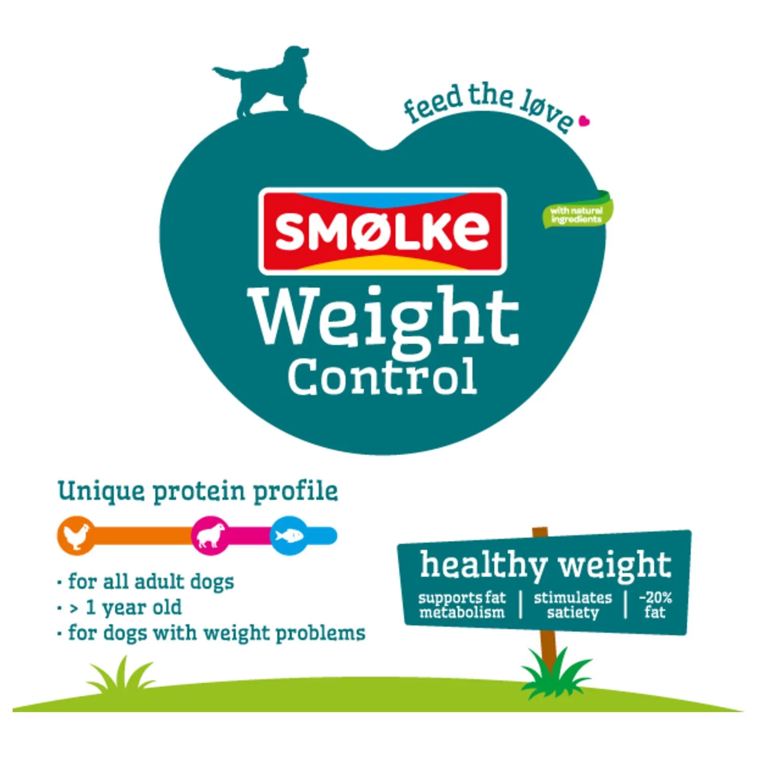 Sommige honden hebben de aanleg om sneller dik te worden. Een speciale voeding is dan van essentieel belang. Weight Control bevat alle voedingsstoffen die je hond nodig heeft, maar heeft minder calorieën, zonder dat je hond een hongergevoel krijgt. Zo bevatten deze brokken 20% minder vet dan het reguliere Smølke volwassen hondenvoer. Daarnaast zijn L-carnitine en choline toegevoegd om de vetstofwisseling te ondersteunen. Zo zal je hond verantwoord afvallen of op een gezond gewicht blijven als hij neigt naar overgewicht.