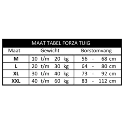 Het Forza tuig is een standaardtuig van Tre Ponti voor grotere honden (van 14 tot 60 kg) van allerlei rassen, met zilveren reflectie-omlijning voor extra zichtbaarheid in het donker. Het tuig heeft geen negatieve drukpunten, echter bij het strekken van de lijn krijgt de hond een pijnloze en lichte druk op de zijflanken. Dit zal bij elke hond een reactie uitlokken. De hond zal meteen inhouden, of stil blijven staan en naar je omkijken om te zien wat er aan de hand is. Door deze reactie te belonen kan het vervelende trekken van de hond beheersbaar worden en met de juiste aanpak zelfs volledig worden afgeleerd.