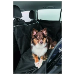 voor de achterbank , anti-slip onderzijde , extra hoge zijkanten voorkomen dat de hond eruit kan springen en beschermen de deurbekleding , door de zijkanten open te ritsen en naar beneden te slaan wordt het in- en uitstappen vergemakkelijkt en beschermen ze tevens carrosserie en bekleding , d.m.v. ritssluiting in tweeën te delen zodat er iemand op de achterbank kan zitten , uitsparingen voor veiligheidsriem hond , polyester