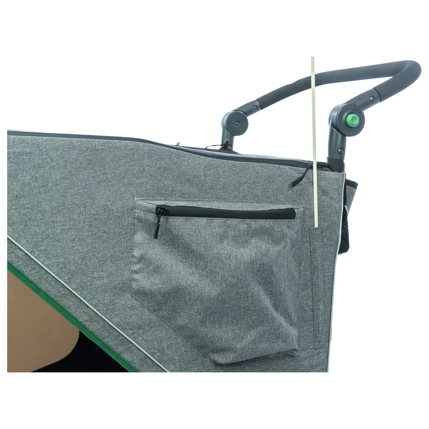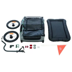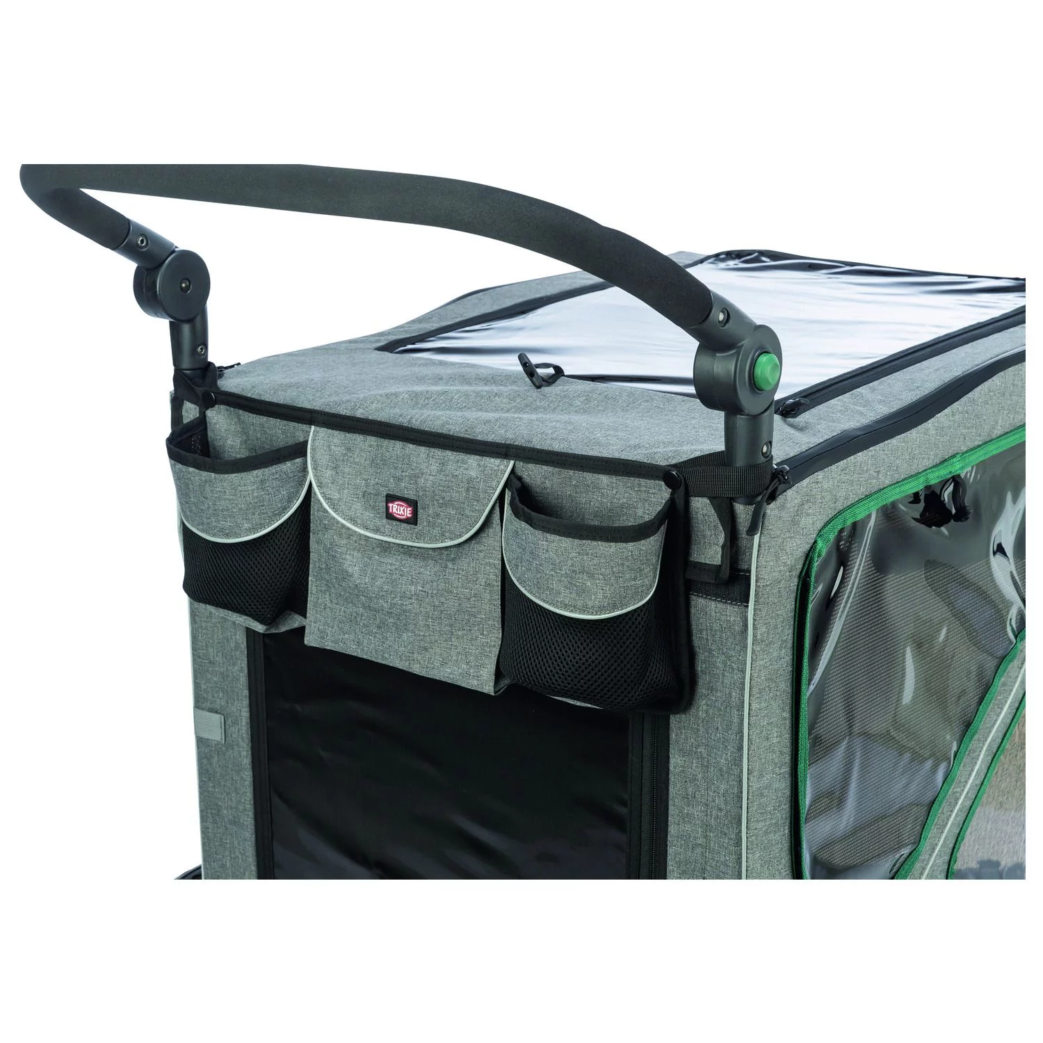 De gaas-inzetstukken van de fietskar zijn voorzien van regenbescherming die afgedekt kan worden wanneer het niet regent. Dit zorgt voor voldoende ventilatie en frisse lucht voor je hond tijdens de rit. De fietskar heeft ook diverse vakken en een bekerhouder, zodat je wat spullen kunt meenemen tijdens de rit. De vastzetrem zorgt ervoor dat de fietskar op zijn plaats blijft staan wanneer je stopt. Verder heeft de fietskar een geïntegreerde korthouder, zodat je hond veilig op zijn plaats blijft zitten tijdens de rit. De duwstang is in hoogte verstelbaar, waardoor je hem gemakkelijk kunt aanpassen aan je eigen lengte. De fietskar heeft ook lussen voor het bevestigen van een achterlicht en reflectoren, zodat je goed zichtbaar bent op de weg. De veiligheidsvlag met reflecterend werkje erin zorgt ervoor dat je nog beter opvalt.