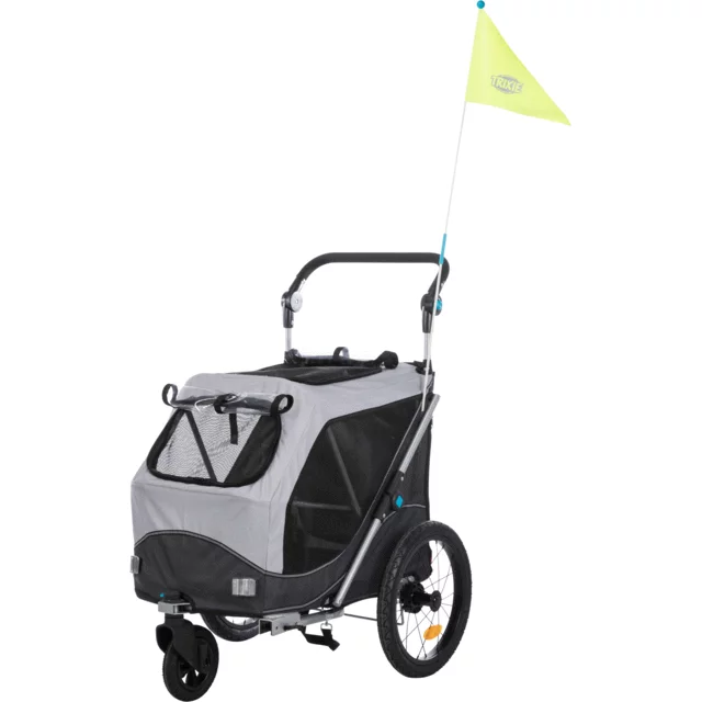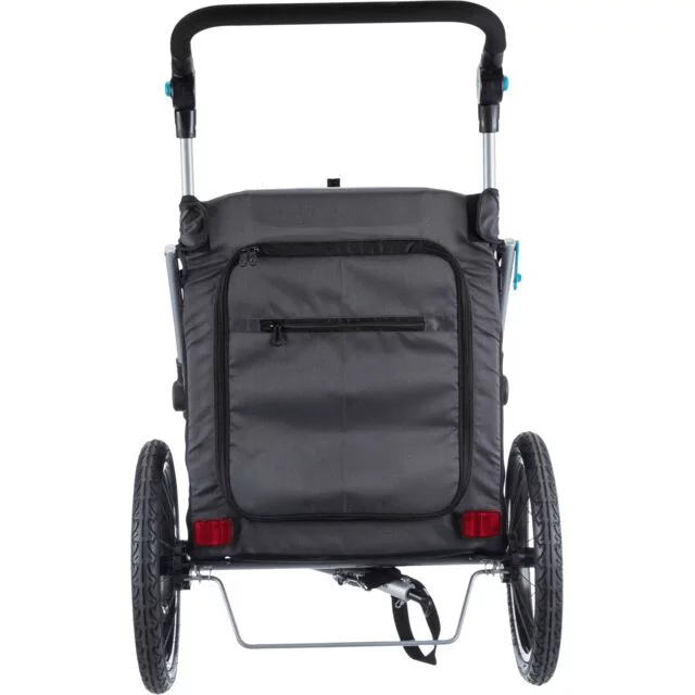 Een extra optie is om de Fietskar om te bouwen naar een buggy met de Jogging Wiel van Trixie. Dit wiel is los te koop en kan je monteren aan de voorkant van de Fietskar. De Fietskar heeft een in hoogte verstelbare duwstang om comfortabel rond te kunnen lopen. Let op: dit Jogging Wiel is niet inbegrepen en dient los te worden aangeschaft.