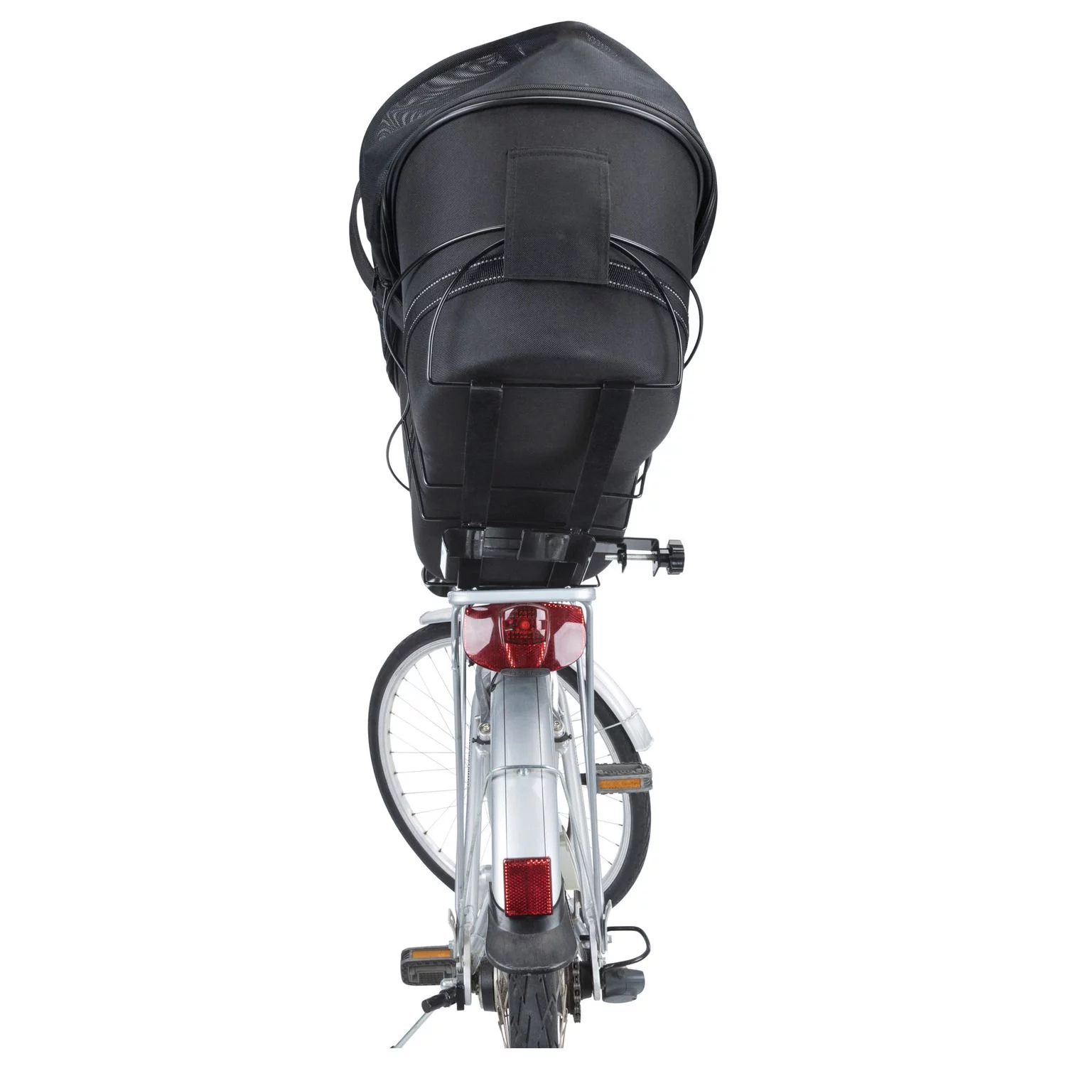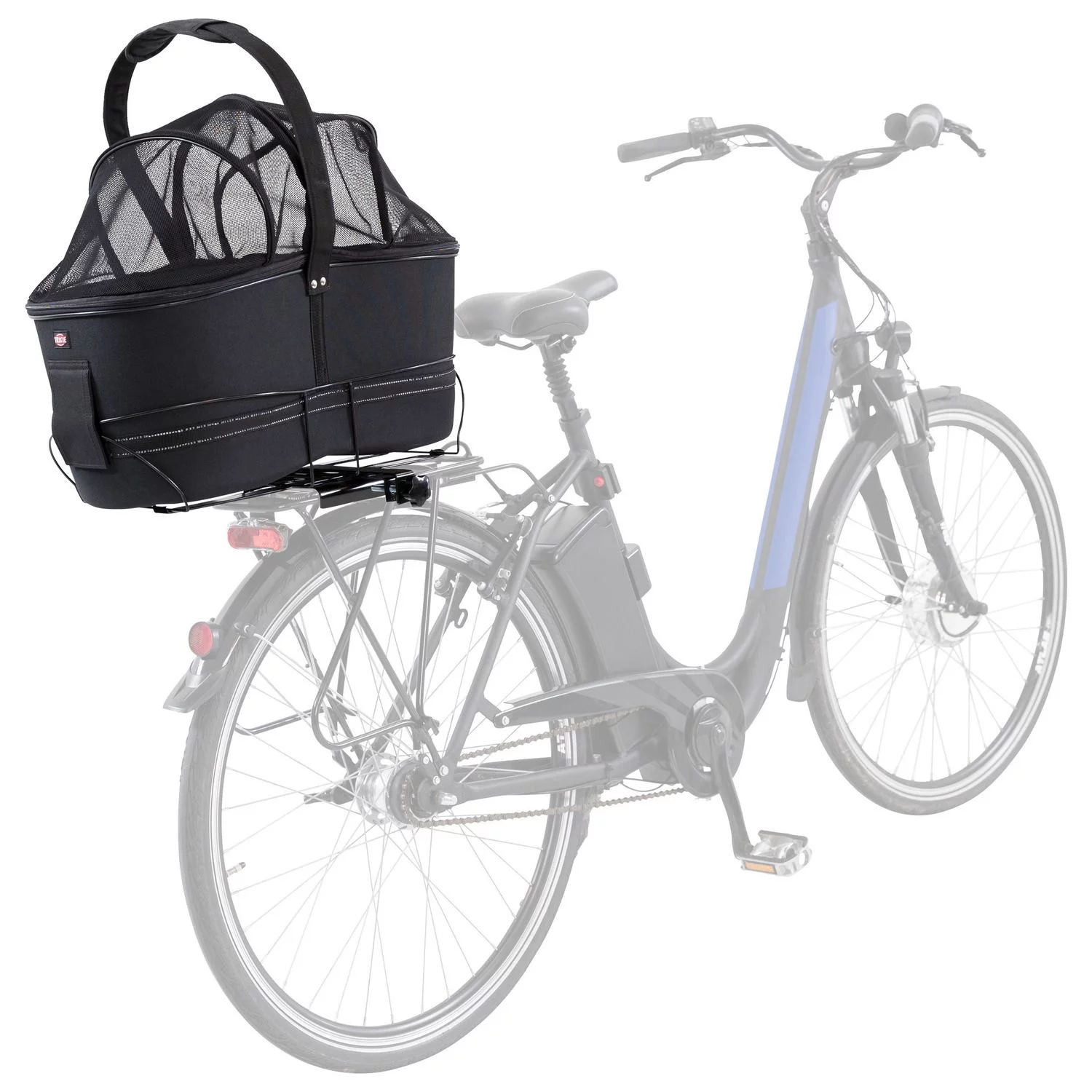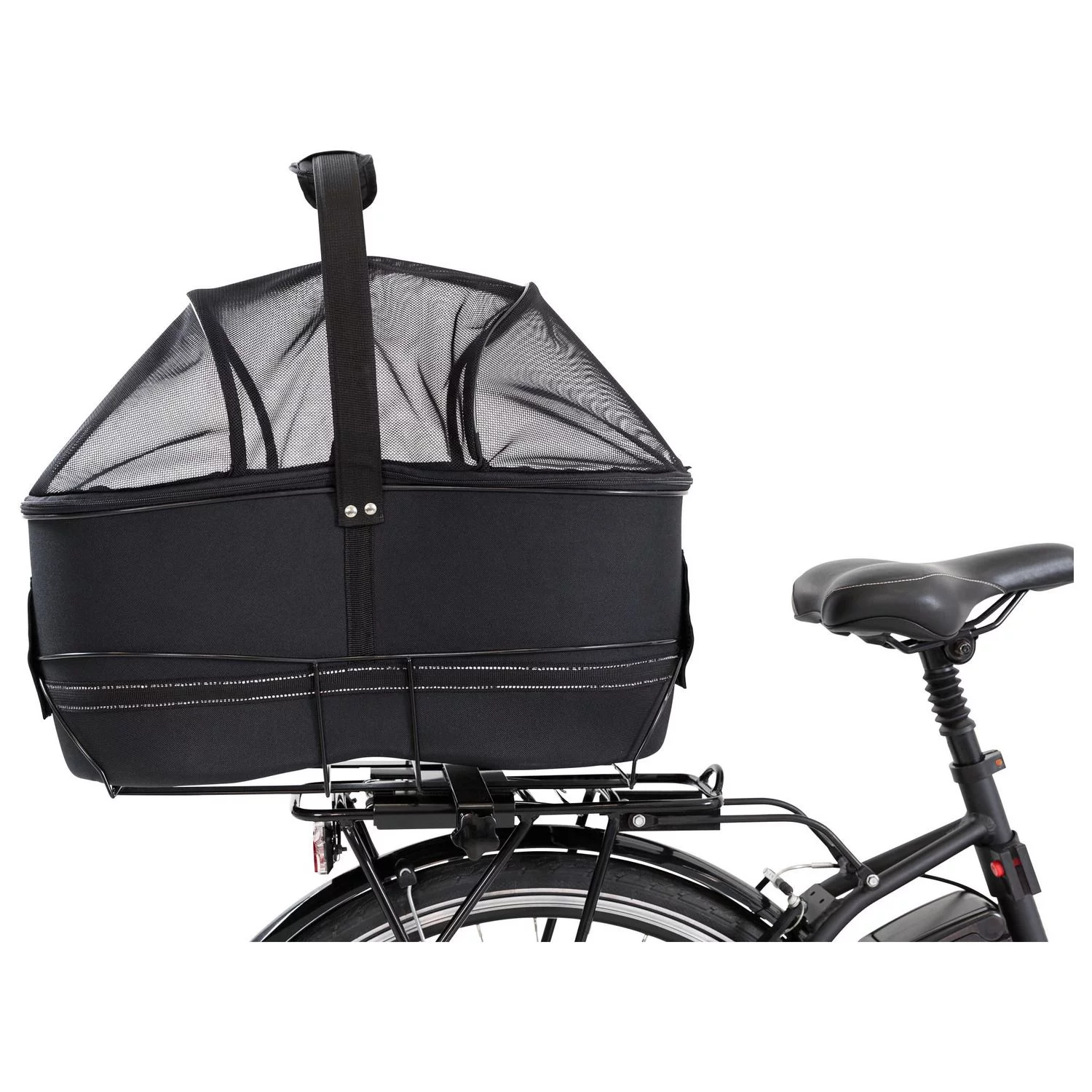 De mand zelf van deze fietsmand is gemaakt van vormvast EVA met gaasafdekking bovenop. Je kan de mand met behulp van het mechanisme vastmaken aan je bagagedrager. Dankzij de koepel en geïntegreerde korthouder zit je hond veilig in de mand en kan deze er niet uitspringen, toch kan hij tegelijkertijd wel genieten van zijn omgeving met de wind in de haren! Door het handvat bovenop is de mand ook makkelijk op te pakken en te dragen. De mand heeft reflecterende elementen voor extra zichtbaarheid in het donker. De mand is middels klittenband van het frame los te maken.