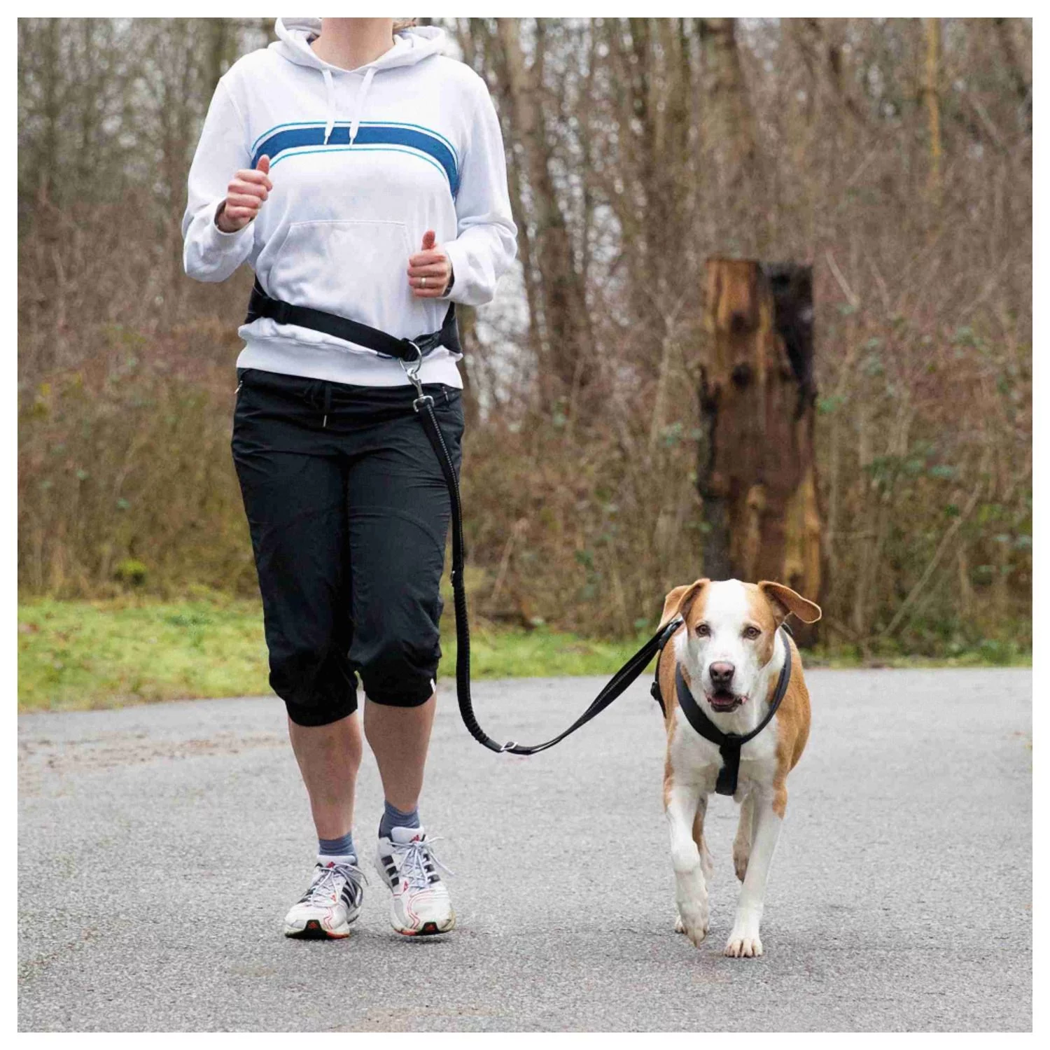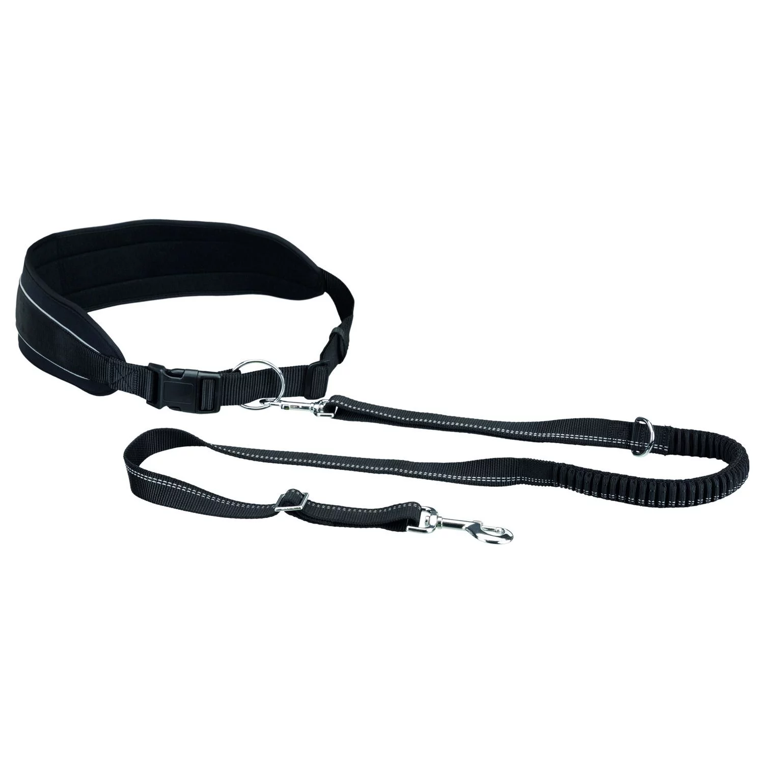 De lijn heeft tevens een handvat zodat deze ook los van de heupriem kan worden gebruikt. Dankzij de reflecterende onderdelen is de hardloopgordel zichtbaar in het donker, zodat je veilig samen kunt hardlopen.