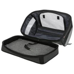 De tas is te openen aan de zij- en voorkant. De geïntegreerde korthouder voorkomt dat je dier uit de tas kan springen, ondanks dat de flappen open staan. In de tas zelf zit je dier comfortabel op de uitneembare, gevoerde bodemplaat met schapenvacht look (gemaakt van polyester). In de buitenvakken kan je nog wat extra spullen stoppen om mee te nemen.