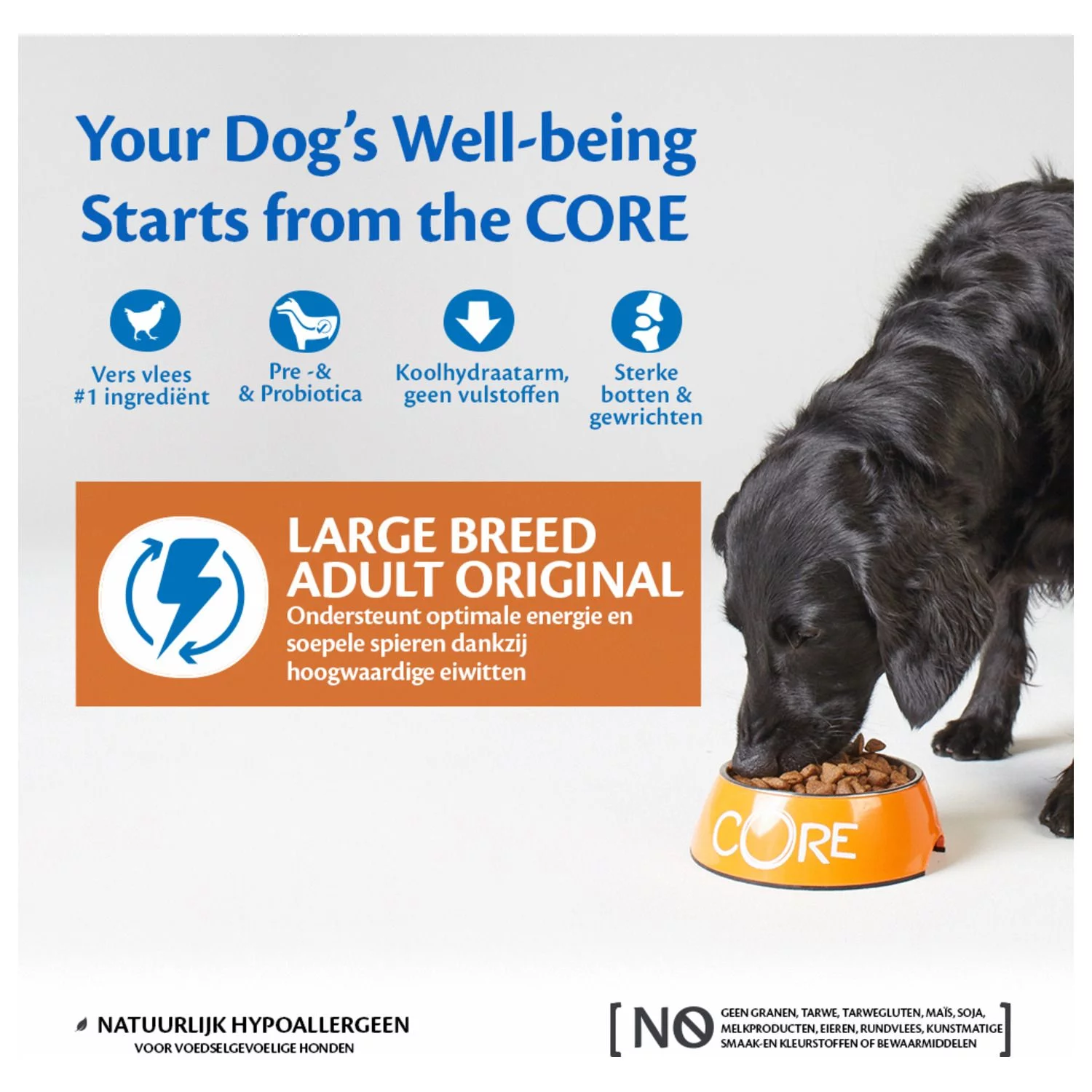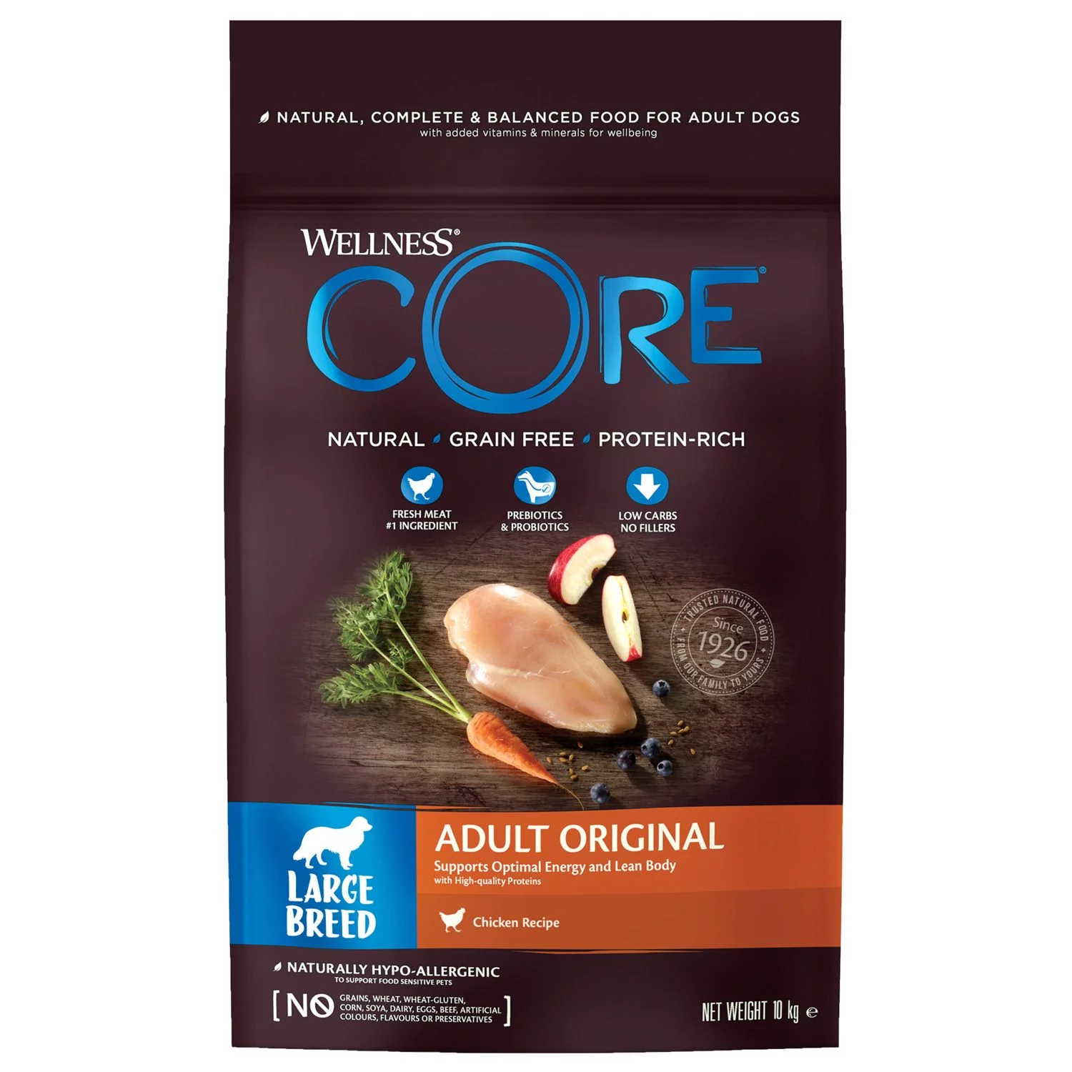 Je wilt je hond natuurlijk de beste van de beste brokken aanbieden. Adult Original Large Breed van Wellness Core is een natuurlijke en complete voeding voor grote volwassen honden, met toegevoegde vitaminen en mineralen. Een voeding rijk aan proteïnen met kip dat wordt aangevuld met onder andere superfoods, plantenextracten en voedingssupplementen. De voeding is daarnaast ook nog eens graanvrij.