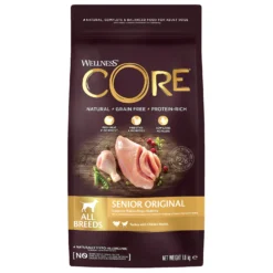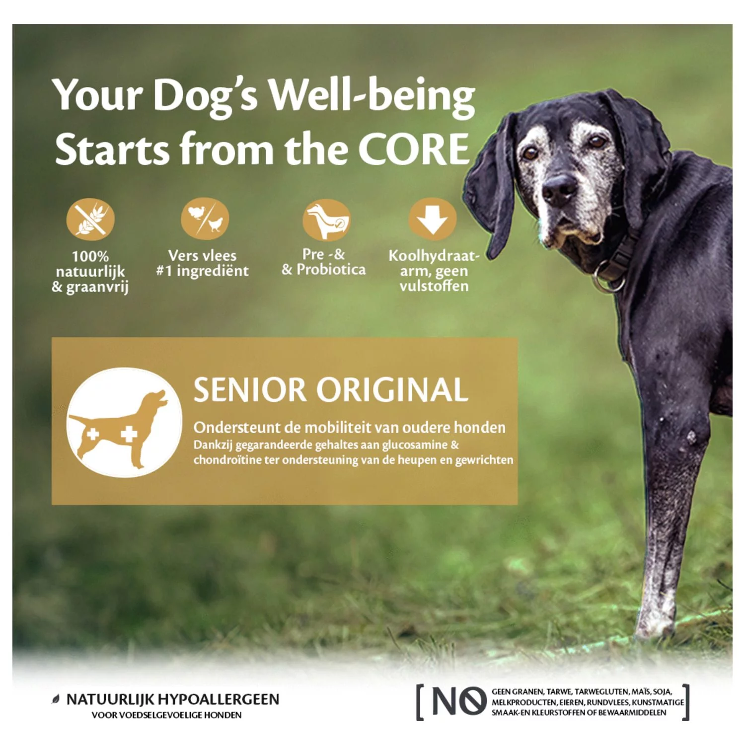 Je wilt je hond natuurlijk de beste van de beste brokken aanbieden. Senior Original All Breeds van Wellness Core is een natuurlijke en complete voeding voor senior honden, met toegevoegde vitaminen en mineralen. Een voeding rijk aan proteïnen met kalkoen en kip dat wordt aangevuld met onder andere superfoods, plantenextracten en voedingssupplementen. De voeding is daarnaast ook nog eens graanvrij.